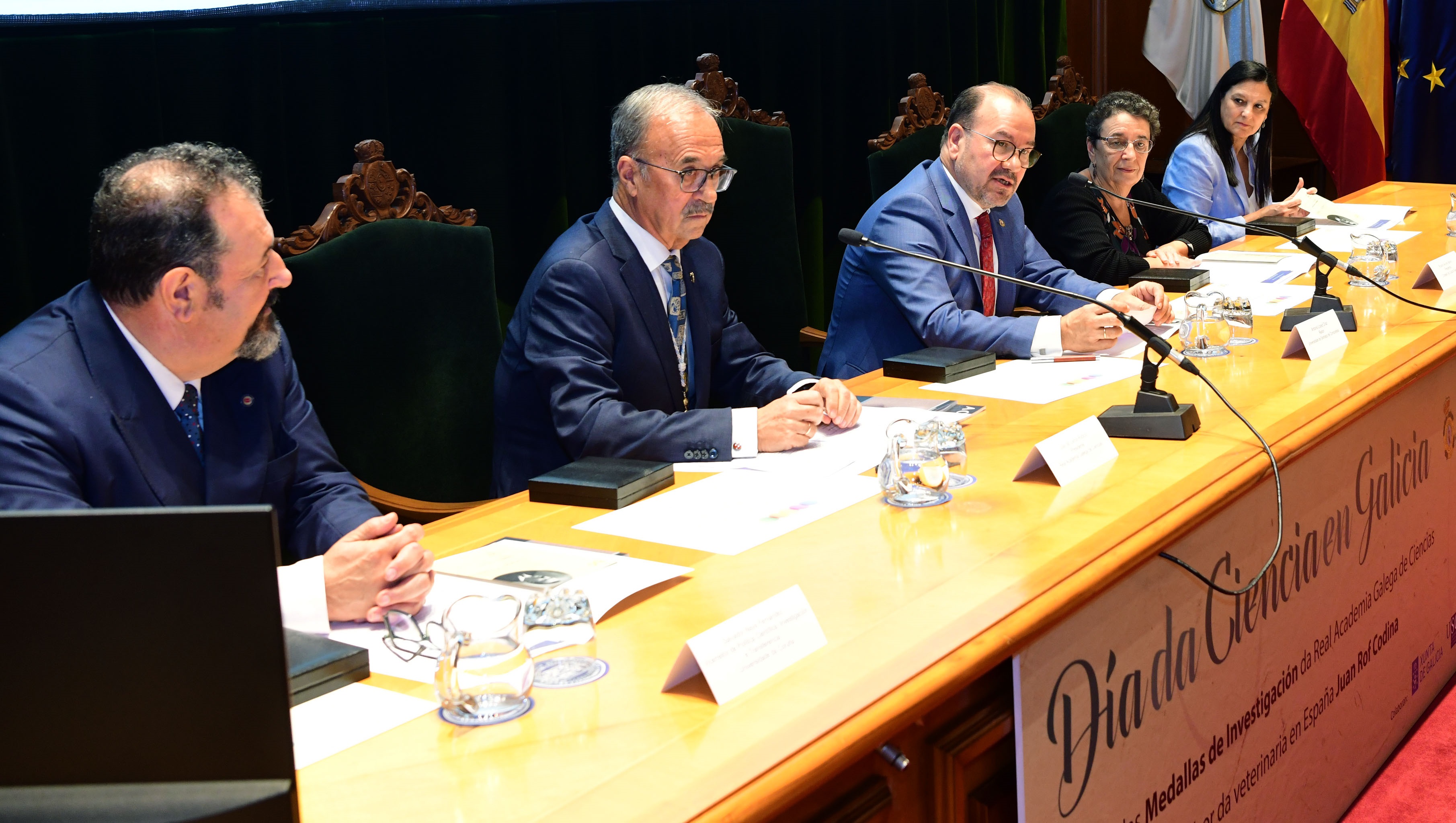 Os catedráticos da USC Jesús López Romalde, Ramón Máiz e Jorge Mira recolleron este xoves 6 as Medallas de Investigación de Galicia que lles outorgou a Real Academia Galega de Ciencias (RAGC) no marco dun acto institucional que serviu para conmemorar o Día da Ciencia na comunidade. A sesión que estivo presidida polo reitor Antonio López tamén rendeu tributo ao impulsor da veterinaria Juan Rof Codina e “ao inmediato entusiasmo que sentiu pola sociedade rural galega, a súa agricultura e a súa gandaría”, tal e como explicou o tamén catedrático da USC, Lourenzo Fernández Prieto, quen pronunciou o relatorio ‘Juan Rof Codina (1874-1967), un veterinario galego doutro tempo, un científico de cando os veterinarios aprendían dos labregos’.