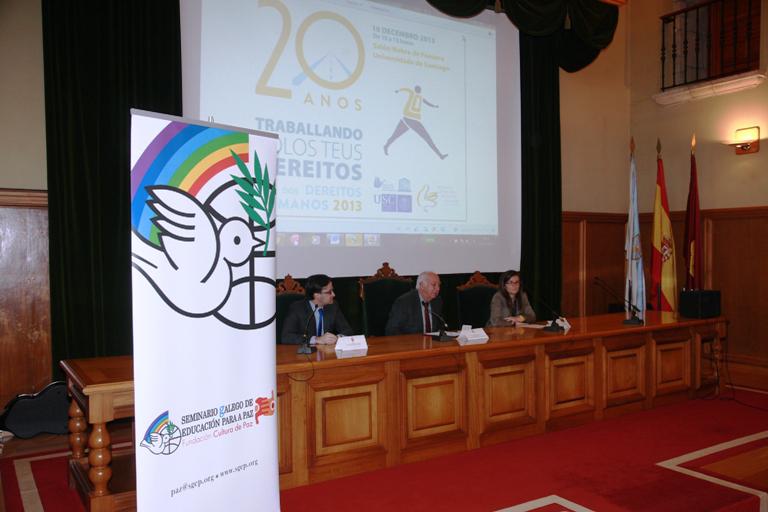 Todos os seres humanos polo feito de naceren libres e iguais en dignidade e dereitos e, tendo como teñen razón e conciencia, débense comportar fraternalmente uns cos outros. Deste xeito principia o texto articulado da Declaración Universal de Dereitos Humanos, documento que cumpre 65 anos de vixencia e que foi obxecto dunha lectura pública nunha xornada celebrada no Salón Nobre do Colexio de Fonseca este martes 10 de decembro, no que tamén se conmemora o Día Internacional dos Dereitos Humanos. A Cátedra Unesco de Cultura de Paz e Dereitos Humanos da USC colaborou co Seminario Galego de Educación para a Paz (SGEP) na organización desta sesión de lectura pública. A xornada contou coa participación do reitor Juan Casares que presidiu o acto que precedeu á lectura, e coa presenza ademais do valedor do Pobo en funcións, José Julio Fernández; da directora académica da Cátedra Unesco, Mar Lorenzo; e do presidente do SGEP, Manuel Dios. A Declaración Universal refírese “á necesidade de compartir e defender que hai un modo de vivir onde respectando uns aos outros, respectámonos a nós mesmos”, dixo Casares, ao tempo que identificou este acto coa manifestación simbólica de que “convivir nun estado de dereito permítenos relacionarnos e vivir xuntos nunha convivencia pacífica sen recorrer á forza como forma de expresión”. José Julio Fernández, pola súa banda, destacou a oportunidade da iniciativa por canto que pon en valor a cultura da promoción dos dereitos e particularmente porque destaca a transcendencia dun documento que é un fito da humanidade. Neste senso, situou a problemática neste ámbito na capacidade de lograr a efectividade do tratado internacional de xeito que se aplique con normalidade e eficiencia. Neste mesmo senso, Manuel Dios lamentouse da sorprendente “invisibilidade da Declaración”, a pesar se que “segue sendo un texto revolucionario que cambiou o panorama da humanidade”. Máis alá da capacidade tecnolóxico demostrada por homes e mulleres ao longo da historia, “o gran desenvolvemento da humanidades non está na tecnoloxía senón que fomos quen de construír un corpus xurídico que regula a convivencia”. A directora da Cátedra Unesco de Cultura de Paz e Dereitos Humanos da USC asegurou que a celebración do Día Internacional dos Dereitos Humanos non é un feito illado, “todos os días a xente loita por ter unhas sociedades máis democráticas, igualitarias”. Non obstante, Mar Lorenzo asegura que “queda un longo percorrido” para alcanzar a plenitude dos dereitos consagrados na Declaración Universal. Tras 65 anos de vida, a declaración require “que a recordemos todos os días” concluíu. Na lectura estaban chamados a participar nenos e nenas de colexios e institutos de Santiago xunto con personalidades do mundo cultura, institucións, entidades sociais e persoas a título individual que quixeran participar libremente neste acto que pretende divulgar e sensibilizar sobre a relevancia e vixencia dos dereitos humanos, sobre a base da igual dignidade humana.