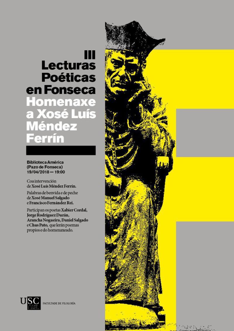 A terceira edición das ‘Lecturas poéticas en Fonseca’ celebraranse este xoves 19 ás 19.00 horas na Biblioteca América da USC, centradas nesta ocasión na obra de Xosé Luís Méndez Ferrín. Ademais do poeta homenaxeado, no acto intervirán Chus Pato, Xabier Cordal, Daniel Salgado, Jorge Rodríguez Durán e Arancha Nogueira, que lerán poemas propios e do propio Méndez Ferrín. Os profesores Xosé Manuel Salgado e Francisco Fernández Rei darán, respectivamente, unhas palabras de benvida e de peche.