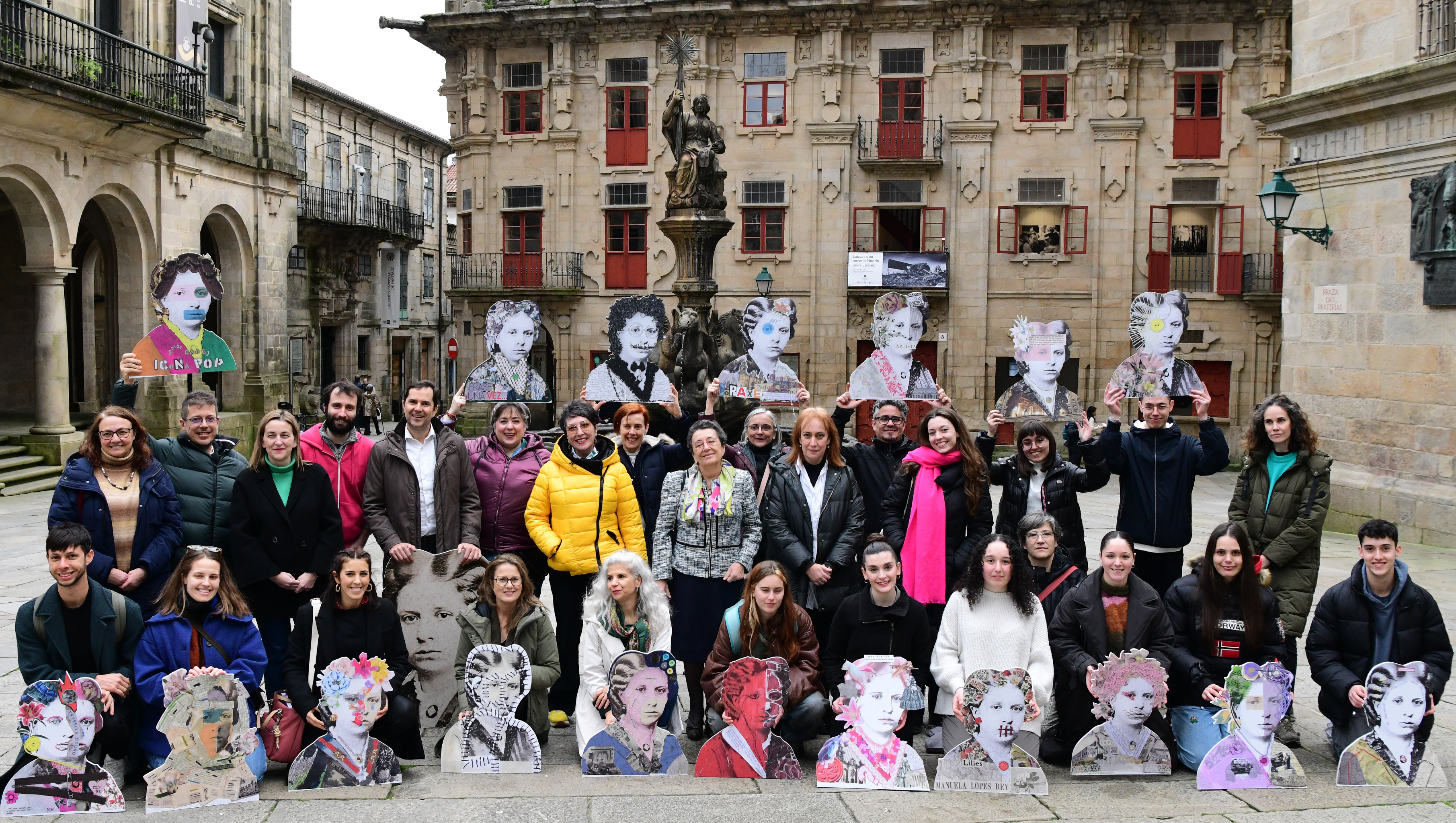 Preto dun cento de estudantes de Ciencias da Educación traballaron na instalación composta por unha serie de bustos que, arredor da imaxe icónica da actriz Manuela Rey, puido contemplarse este mércores 6 na Praza de Praterías, así como na Casa do Cabido en Compostela. A iniciativa enmárcase nunha nova vaga das Faíscas Culturais coa que se pretende homenaxear a figura desta galega que se converteu, aos 23 anos, na primeira actriz do teatro lisboeta Dona María II, e que deixou unha traxectoria vital e profesional aínda moi descoñecida. As profesoras responsables da instalación que leva por nome ‘Manuela Rey is in the street’ son Cristina Trigo (Educación Plástica II: Procesos e proxectos artísticos, do Grao de Educación Primaria) e Olalla Cortizas (Deseño e desenvolvemento de metodoloxías artísticas, do Grao de Educación Infantil).