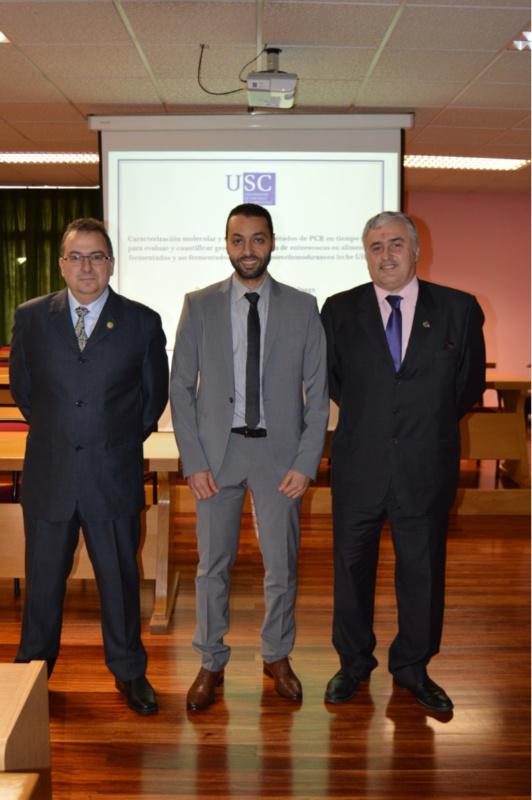 O desenvolvemento desta nova metodoloxía é unha das achegas da tese de doutoramento que vén de presentar na USC o exipcio Mohamed Ibrahim Mohamed Bouelnaga baixo o título 'Caracterización molecular e desenvolvemento de métodos de PCR en tempo real para avaliar e cuantificar xenes de virulencia de enterococos en alimentos fermentados e non fermentados, e Bacillus sporothemodurans en leite UHT'. Esta investigación de doutoramento, dirixida polos profesores do Departamento de Química Analítica, Nutrición e Bromatoloxía Carlos Manuel Franco Abuín e José Manuel Miranda López, está estruturada en tres capítulos e deu pé a outras tantas publicacións en revistas con índice de impacto do máis alto nivel. No primeiro dos capítulos, Mohamed Ibrahim Mohamed Bouelnaga, analiza a presenza de factores de virulencia asociados a cepas de enterococos illados de alimentos fermentados e non fermentados, como o queixo o ou leite, ademais de estudar a presenza de resistencias fronte a diversos antimicrobianos de ditas cepas de enterococos. Estas pescudas realizadas por Mohamed Bouelnaga, que se converteu no primeiro investigador de orixe exipcia que defende unha tese de doutoramento no Campus Terra da USC, arroxaron como resultado que o proceso de fermentación pode estar involucrado nunha maior presenza dos referidos factores de virulencia. Outra das conclusións atinxe ao feito de que nos alimentos non fermentados, sobre todo en carnes frescas, atópase un maior número de cepas resistentes a diversos antimicrobianos. Nunha fase posterior da súa investigación de doutoramento, Mohamed Bouelnaga puxo a punto unha metodoloxía molecular para cuantificar directamente a presenza dalgúns destes factores de virulencia en alimentos, unha novo avance cuxos resultados puxeron de manifesto a versatilidade a utilidade do emprego destas técnicas para o control alimentario no marco da seguridade alimentaria. Tribunal da tese e cualificación O profesor de Investigación do CSIC de Vigo Santiago Aubourg Martínez presidiu o tribunal da tese, do que tamén formaron parte o profesor titular da Universidade de Valladolid Emiliano Quinto Fernández e a profesora titular da USC Beatriz Vázquez Belda, que desenvolveu as funcións de secretaria. Os membros do tribunal destacaron a calidade e as importantes contribucións científicas realizadas por Mohamed Bouelnaga na súa tese de doutoramento, razón pola que lle outorgaron por unanimidade a cualificación de sobresaínte cum laude.
