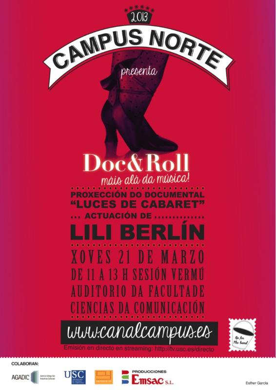 A actriz e cantante Blanca Cendán e o pianista Suso Alonso ofrecerán este xoves 21 a partir das 11.00 horas o espectáculo ‘Lili Berlín’ no auditorio da Facultade de Ciencias da Comunicación. Esta actuación é parte da actividade ‘Doc & Roll’, promovida polo equipo Canal Campus da USC e inclúe a proxección dun documental sobre o filme Cabaret e un debate cos compoñentes de Lili Berlín. Esta dinámica dá continuidade ás actuacións que xa se realizaron tanto o pasado curso como no presente coa participación de Doctor Gringo e Wöyza e a proxección de documentais de temática musical. En horario de 11.00 a 13.00 horas e tamén en streaming en www.canalcampus.es, nesta ocasión o documental a proxectar será ‘Luces de cabaret’ que trata sobre como se realizou o filme Cabaret protagonizado por Liza Minnelli. Tras o visionado da cinta, Blanca Cendán e Suso Alonso actuarán e manterán un coloquio. O proxecto ‘Doc & Roll’ pretende dar a coñecer e promover os conxuntos musicais integrados por estudando da institución universitaria e está aberta a todos os estilos musicais sen excepción. Na iniciativa colaboran a Axencia Galega das Industrias Culturais (AGADIC), a USC e as firmas Emsac e Estudio 54. Estes eventos son organizados polo equipo Canal Campus (www.canalcampus.es), coordinado polo profesor Xaime Fandiño, que traballa no eido Estudos da Música Popular desde a perspectiva da comunicación. Este ano colaboran na produción do evento os alumnos de terceiro curso de Comunicación Audiovisual.