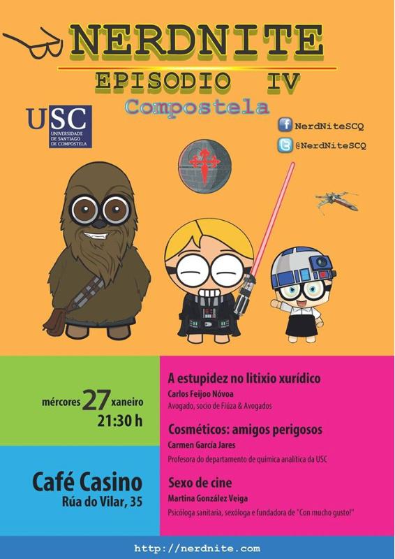 Este mércores 27 terá lugar unha nova NerdNite SCQ no Café Casino (Rúa do Vilar, 35) na que, como é habitual, se tratarán tres suxestivos temas.