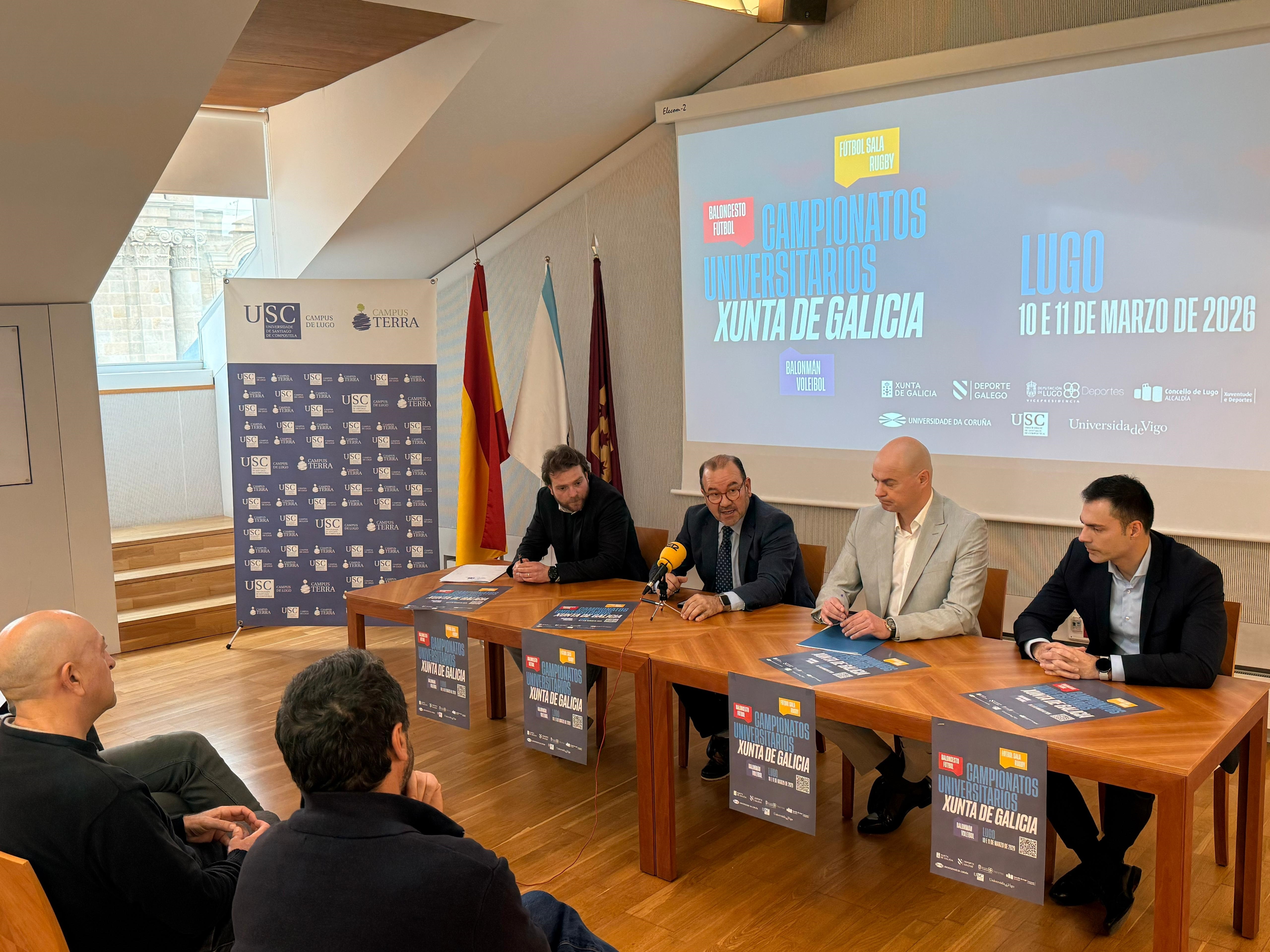 Os XXVIII Campionatos Universitarios Xunta de Galicia de Deportes Colectivos, que impulsa o Goberno galego, desenvolveranse os días 10 e 11 de marzo en Lugo. O programa foi presentado este xoves 5 no Pazo de Montenegro nun acto no que interviñeron o reitor Antonio López Díaz, o director territorial da Consellaría de Presidencia, Xustiza e Deportes na provincia, Francisco Javier Vázquez Nodal; o concelleiro da área de Urbanismo, Deportes e Xuventude, Jorge Bustos; e o deputado provincial da área de Promoción Económica e Social, Pablo Rivera.