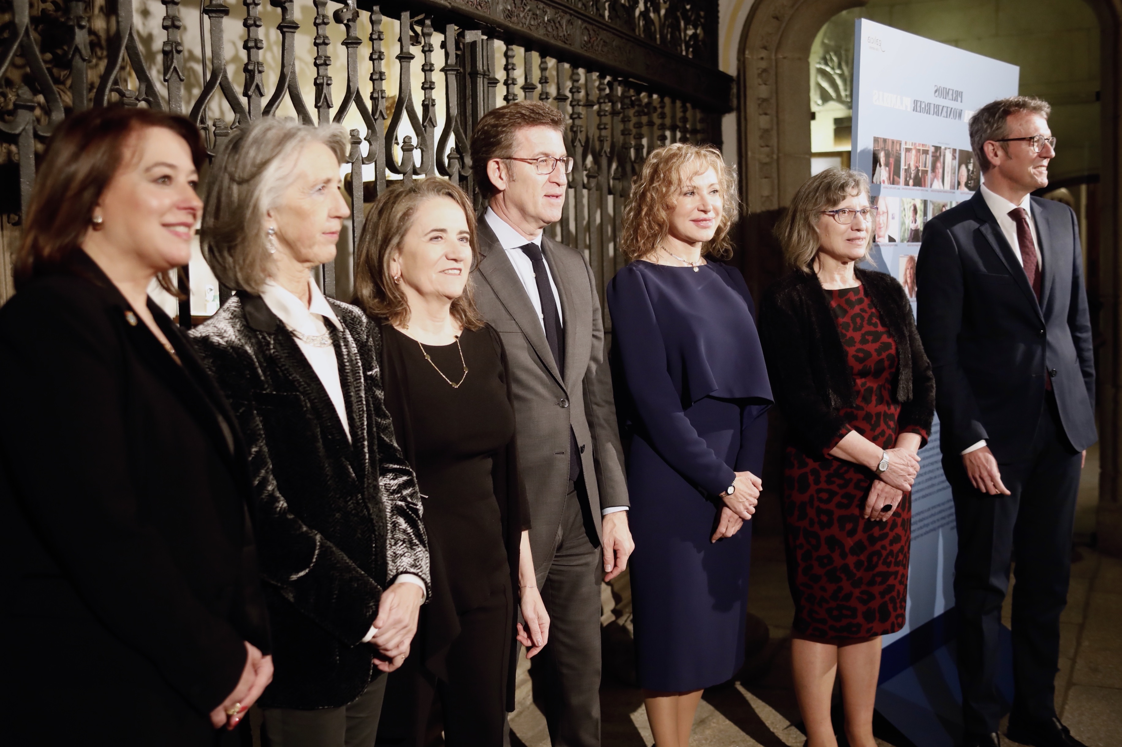 De esquerda a dereita, a secretaria xeral de Igualdade, Susana López Abella; Alicia Estévez e María José Alonso, premiadas en edicións anteriores; o presidente da Xunta, Alberto Núñez Feijóo; a galardoada,  Mabel Loza; Peregrina Quintela, premiada en edicións anteriores; e o vicepresidente Alfonso Rueda