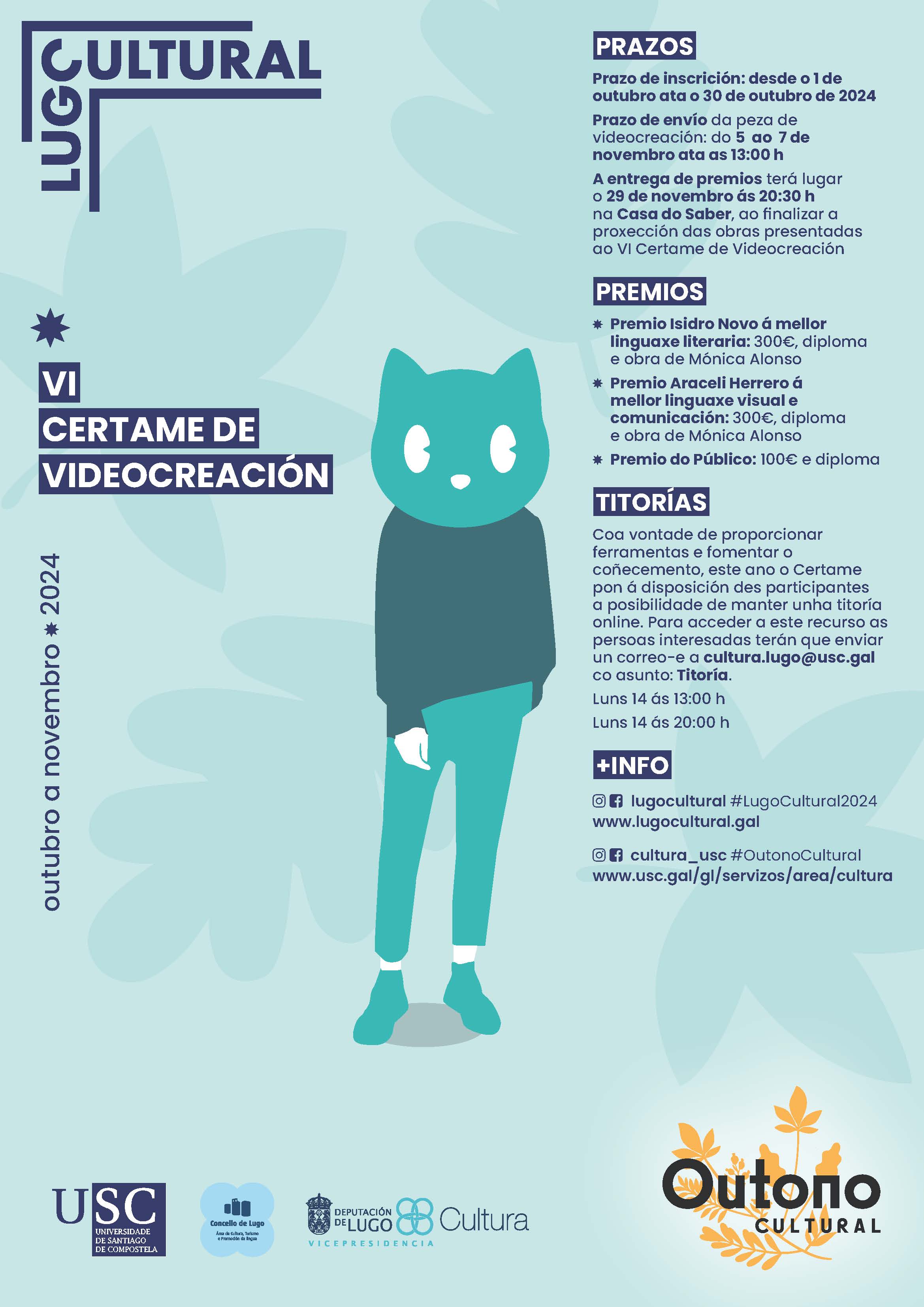 A sexta edición do Certame de Videocreación mantén aberta a súa inscrición ata o 30 de outubro a través dun formulario en liña. As persoas participantes, tamén maiores de 16 anos, poderán inscribirse de xeito individual ou colectivo. A duración de cada peza audiovisual alcanzará un máximo de 5 minutos, incluíndo a cortina inicial e os créditos. O prazo de envío das pezas esténdese do 5 ao 7 de novembro, ata as 13.00 horas. Poderase enviar unha ligazón a calquera plataforma audiovisual, sempre e cando a peza participante sexa descargable e non estea en aberto, —garantindo que no momento da súa proxección sexa inédita— a través de WeTransfer a cultura.lugo [at] usc.gal (cultura[dot]lugo[at]usc[dot]gal).