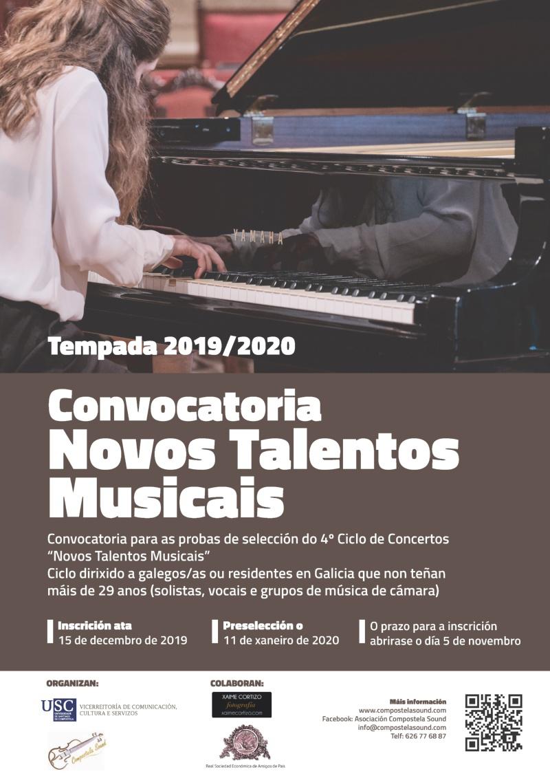 A USC e a Asociación Compostela Sound organizan o cuarto ciclo de concerto ‘ Novos Talentos Musicais’ para a promoción de novos músicos/as galegos, residentes en Galicia ou estudantes de centros música da comunidade autónoma. Este Ciclo diríxese a solistas de todos os instrumentos, cantantes e grupos de música de cámara menores de 29 anos. Constará de seis recitais compartidos no mes de marzo que terán lugar no Paraninfo da Universidade e na sala da Real Sociedade Económica de Amigos do País en Santiago de Compostela.