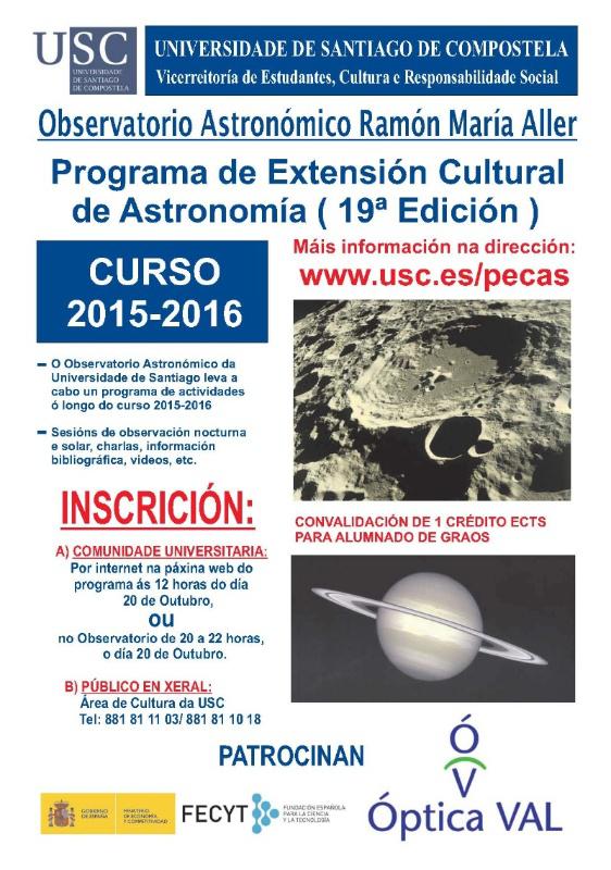 O Observatorio Astronómico Ramón María Aller da USC (OARMA) lanza a 19ª edición do Programa de Extensión Cultural de Astronomía (PECAS) a desenvolver ao longo do curso académico 2015-2016. A matrícula para os membros da USC –ao alumnado de graos que curse o programa con aproveitamento lle será convalidado 1 crédito ECTS– será por internet o día 20 de outubro a partir das 12.00 horas ou no Observatorio de 20.00 a 22.00, en tanto que a cidadanía en xeral deberá de apuntarse na Área de Cultura da USC no Pazo de San Xerome.