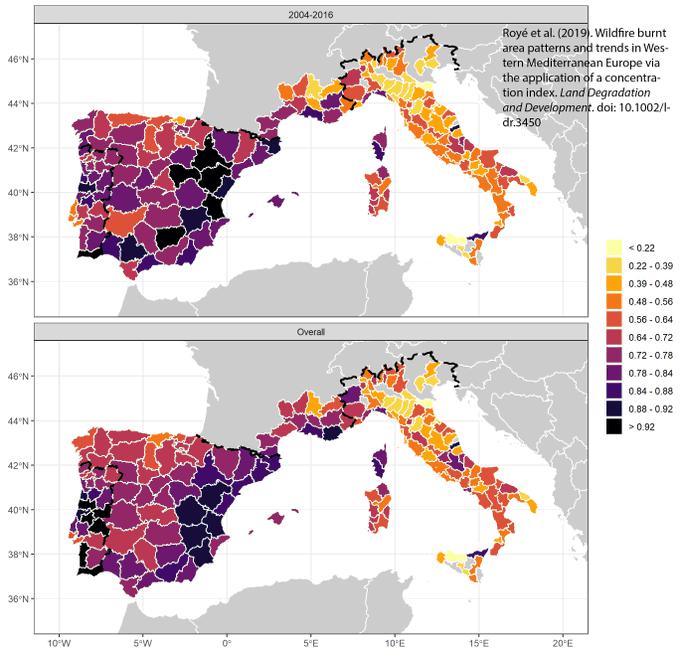 Un estudo internacional, dirixido polo investigador da USC Dominic Royé, e no que participan investigadores de varias universidades de España, Portugal, Francia e Italia, chegou á conclusión de que nos últimos tempos produciuse un incremento importante da área queimada concentrada nun menor número de incendios forestais. No estudo analizáronse patróns e tendencias das áreas queimadas por incendios forestais nos citados países mediante a aplicación dun índice de concentración.