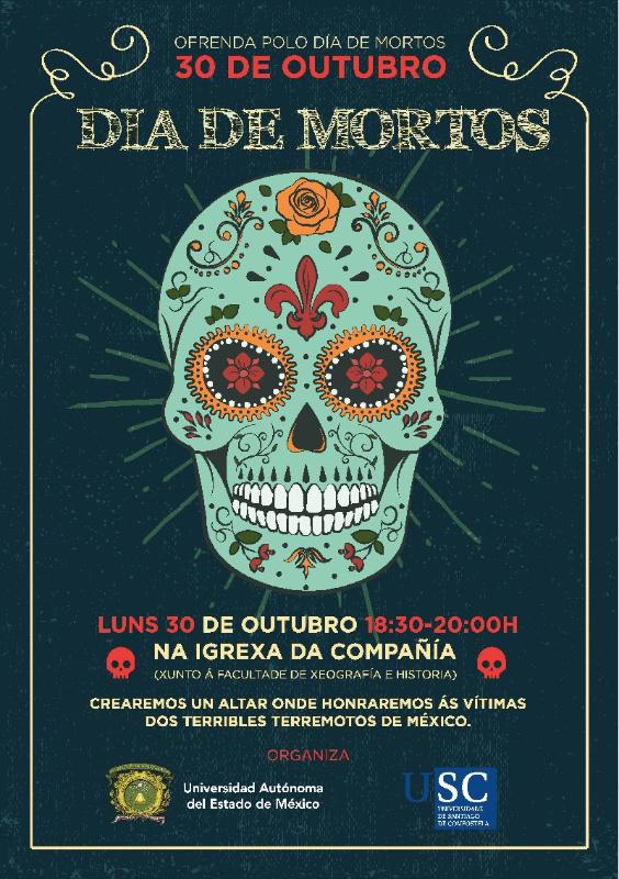 A Universidade de Santiago de Compostela e a Universidade Autónoma do Estado de México (UAEM) celebrarán o próximo luns 30 unha ofrenda polo Día de Mortos, unha tradición que en México vén do século XV, coa chegada dos españois, e que en 2003 a Unesco declarou como Obra Mestra do Patrimonio Oral e Intanxible da Humanidade. O acontecemento terá lugar ás 18.30 horas na Igrexa da Universidade, onde se colocará un altar con alimentos, bebida e obxectos simbólicos que escenifiquen a tradición e trasladen os asistentes dende Galicia a México, un país cunha forte identidade e grandes tradicións.