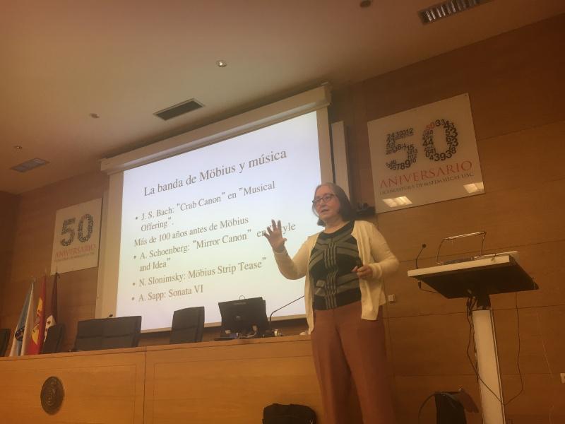 A profesora da Linköping University Milagros Izquierdo analizou nunha conferencia na Facultade de Matemáticas como a banda de Möbius interrelaciona as matemáticas e a arte e como ten inspirado a numerosos artistas ao longo do século XX aínda que, como lembrou na súa intervención, unha das primeiras se construíu en literatura por Lewis Carrol. Así a profesora Izquierdo usou a banda para ilustrar como os conceptos matemáticos nos axudan a entender a arte e como, esta última disciplina, axuda á súa vez a ‘ver’ conceptos matemáticos.