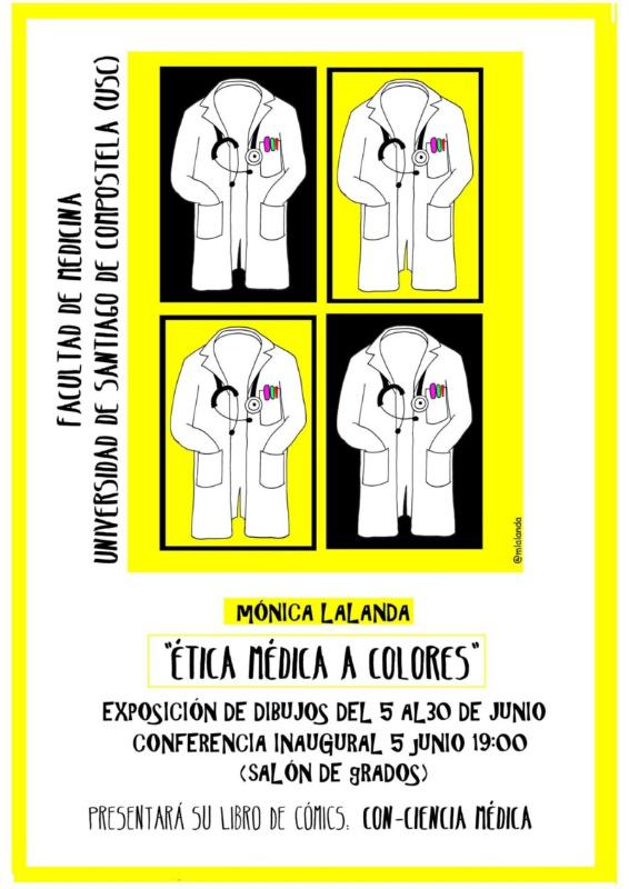 O claustro baixo da Facultade de Medicina acollerá a partir do luns 5 e ata o 30 de xuño a exposición ‘Mónica Lalanda: Ética médica a colores’. O acto inaugural terá lugar ás 19.oo horas e a el seguiralle na Sala de Graos da Facultade a presentación do seu libro en formato cómic, Con-Ciencia Médica, que recolle as láminas da mostra.