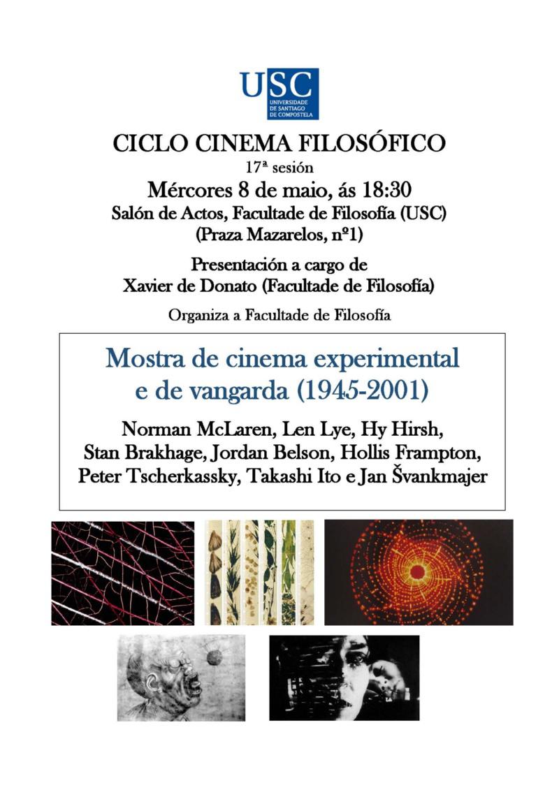 O Ciclo de cinema filosófico organizado pola Facultade de Filosofía prosegue este mércores 8 cunha sesión dedicada ao cinema experimental e de vangarda que presentará Xavier de Donato ás 18.30 horas no Salón de Actos da Facultade.