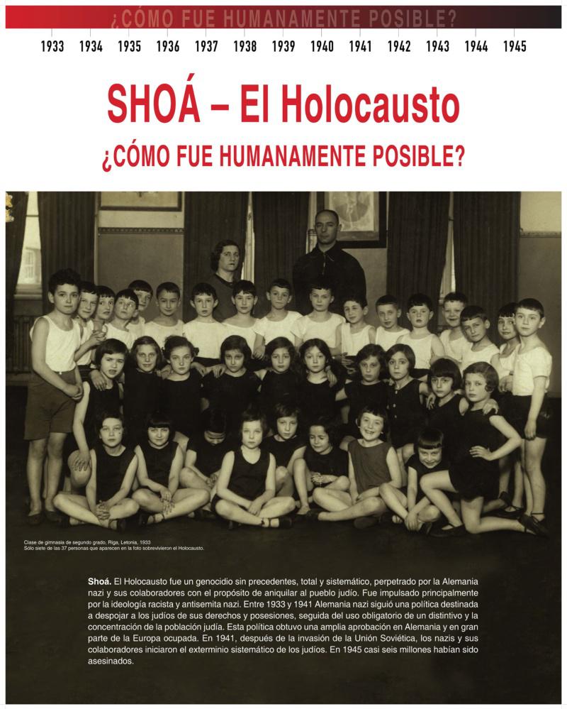 A mostra confórmana varios paneis nos que se detalla o contexto sociopolítico da época, e en concreto do pobo xudeu, o nacemento e expansión da ideoloxía nazi e finalmente o exterminio desa comunidade nos campos de concentración. Todo isto ilústrase con documentos gráficos e testemuños de superviventes da barbarie.