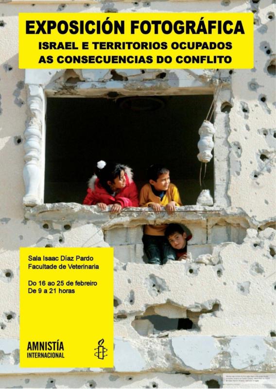 Trinta e cinco paneis sobre 12 temas sensibles de Israel e os territorios ocupados conforman a exposición fotográfica que, dende este mércores 16 ata o vindeiro 25 de febreiro pode visitarse na sala Isaac Díaz Pardo da Facultade de Veterinaria de Lugo. A mostra, titulada ‘Israel e Territorios ocupados. As consecuencias do conflito’, está organizada por Amnistía Internacional se inaugura na tarde deste mércores. Ao longo da exposición fotográfica, que pode ser visitada en horario de 9:00 a 21.00 horas, analizase o conflito en Oriente Próximo como fonte de violación dos dereitos humanos. Os bombardeos, a transferencia de armas, a liberdade de circulación, a impunidade, os desaloxos forzados, o dereito á auga, a tortura e os malos tratos, mulleres e menores, así como o traballo de Anmistía Internacional sobre o terreo son os eixos temáticos desta mostra.