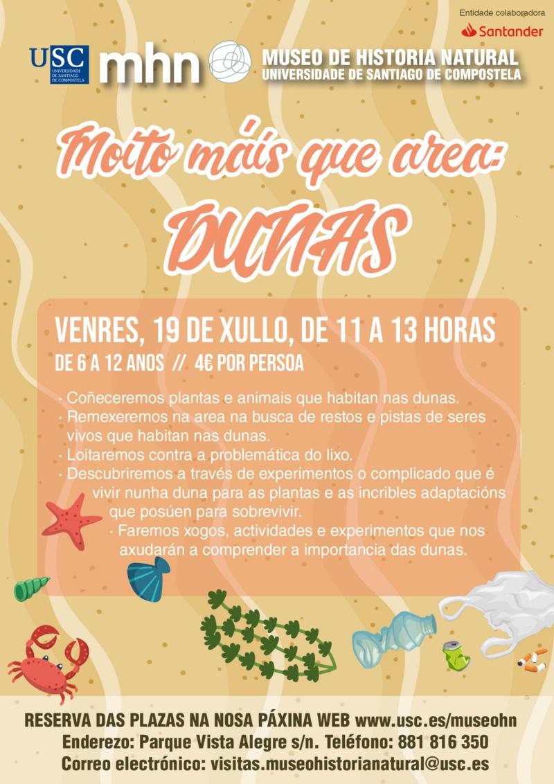 O Museo de Historia Natural organiza a vindeira semana o obradoiro infantil ‘ Moito máis que area: dunas’, unha actividade dirixida a rapaces de rapazas de 6 a 12 anos que se desenvolverá en horario matinal, de 11.00 a 13.00 horas, o venres 19.