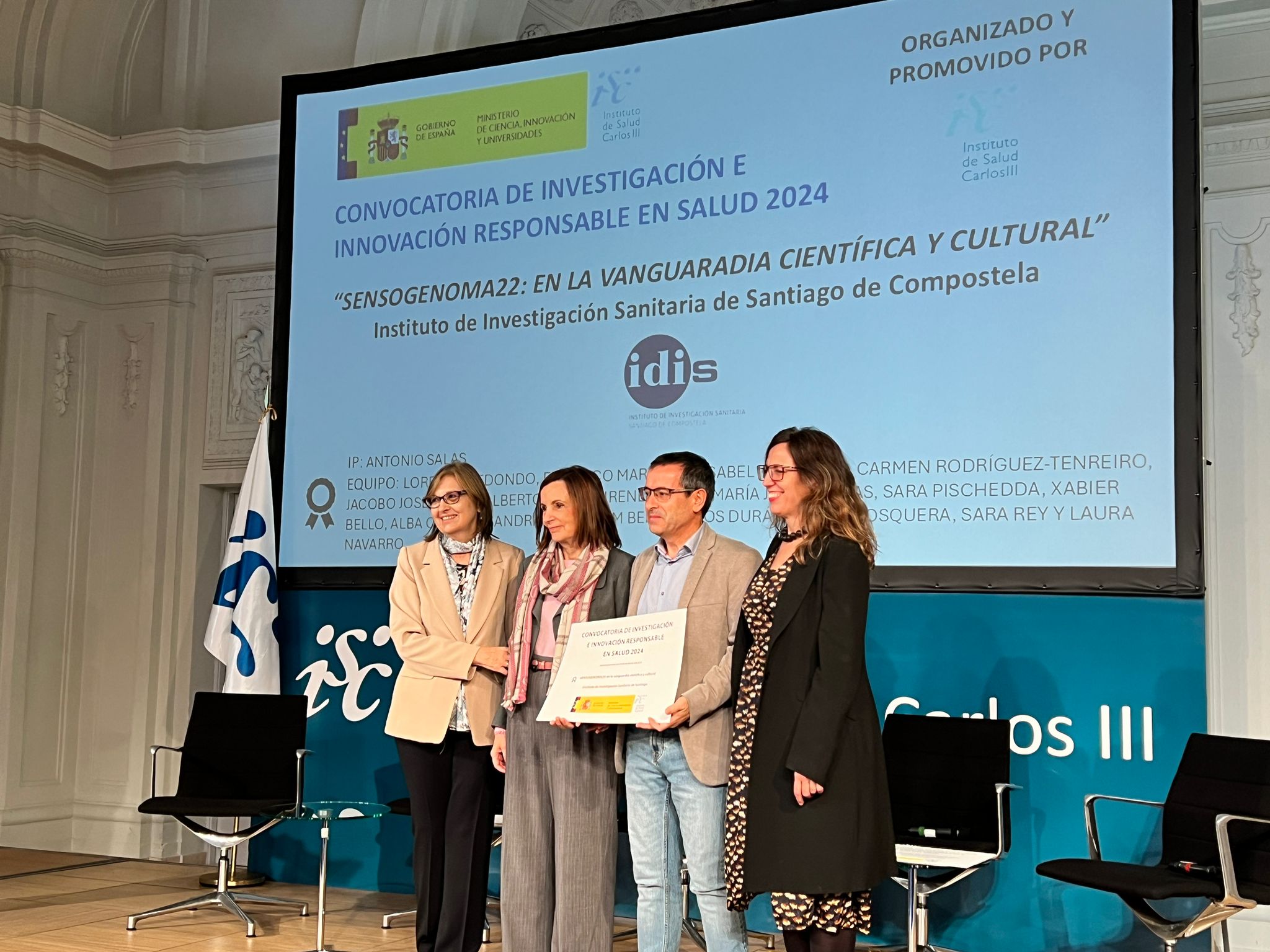 A iniciativa musical e científica Sensoxenoma foi unha das propostas premiadas na convocatoria de Investigación e Innovación Responsable en Saúde que impulsa o Instituto de Saúde Carlos III (ISCIII). A cerimonia de entrega do galardón tivo lugar este xoves en Madrid e a ela asistiron o investigador principal do proxecto, Antonio Salas Ellacuriaga, catedrático da Facultade de Medicina da USC e investigador do IDIS; a directora científica do IDIS, Mª Luz Couce Pico, e a investigadora Laura Navarro Ramón. Recolleron o premio da man da directora do ISCIII, Marina Pollán.