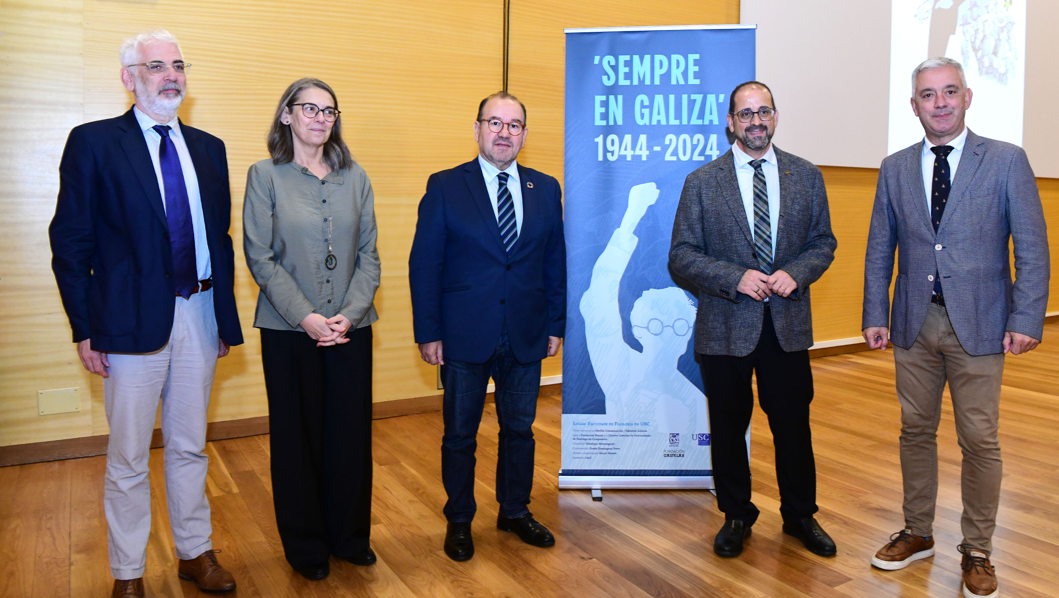 O decano Elias Feijó, esquerda, a vicedecana Elsa González, o reitor Antonio López, o director da Cátedra, Henrique Monteagudo; e o secretario xeral da Lingua, Valentín García. FOTO: Santi Alvite