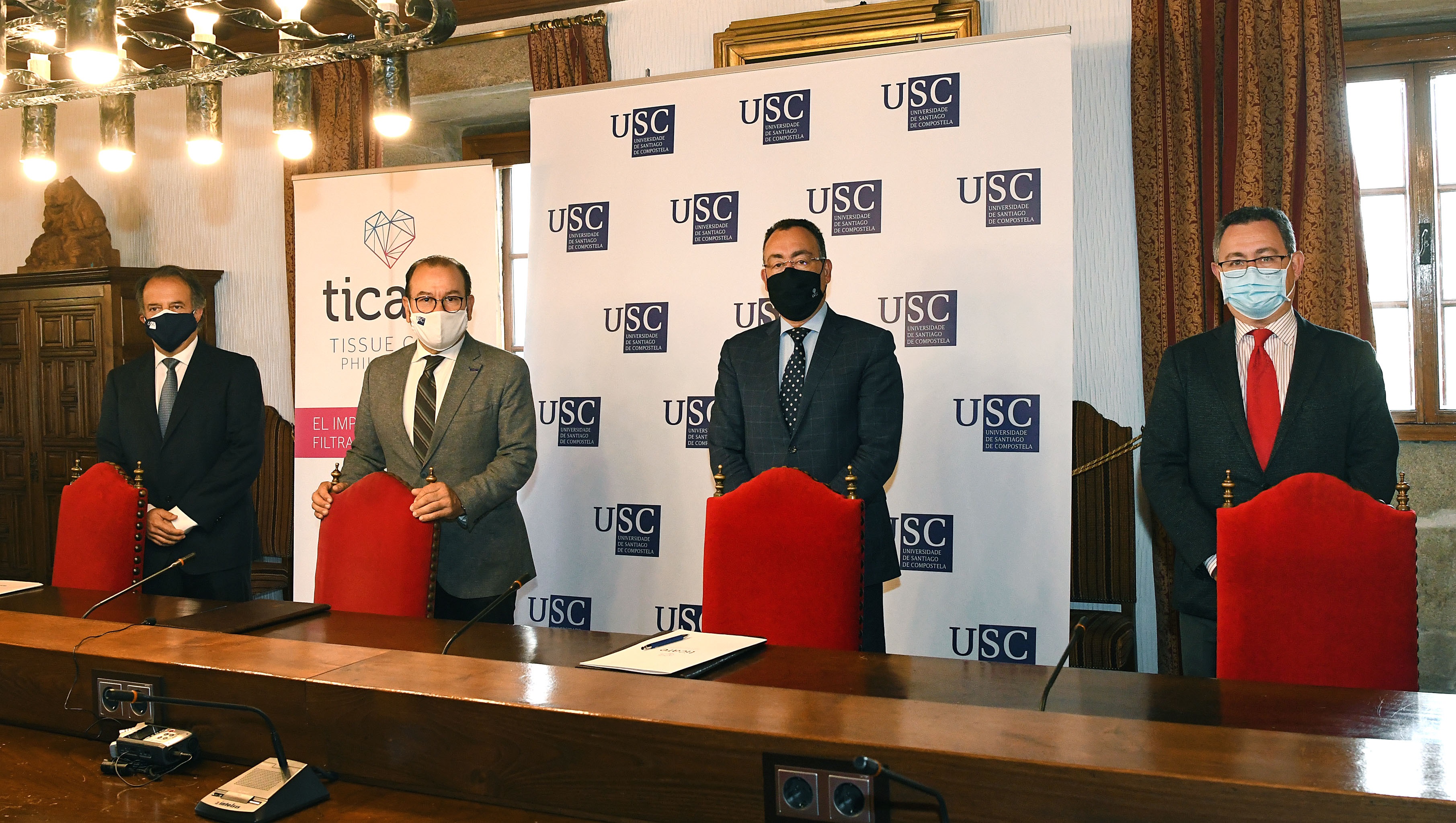 No acto de presentación da Cátedra, o reitor Antonio López quixo subliñar que o ámbito sanitario e, nomeadamente, a biomedicina constitúe un “eixo esencial” para a USC. Con este acordo, apuntou Antonio López, “sumamos unha pedra máis a este proxecto, un elemento estratéxico da Universidade”. Pola súa parte, Fernando Mozo puxo o foco no “orgullo que supón para Ticare colaborar cunha institución que conta con máis de cinco séculos de historia”. No acto de sinatura tamén estiveron presentes o director da cátedra, Juan Blanco Carrión; o decano da Facultade de Medicina, Julián Álvarez; e Ángel Mozo, adxunto á dirección xeral de Ticare. Os vicerreitores de Planificación, Tecnoloxías e Sustentabilidade, Gumersindo Feijoo Costa; e de Calidade, Jacobo Limeres Pose, tamén estiveron presentes no acto, xunto a unha representación de profesorado da Facultade.