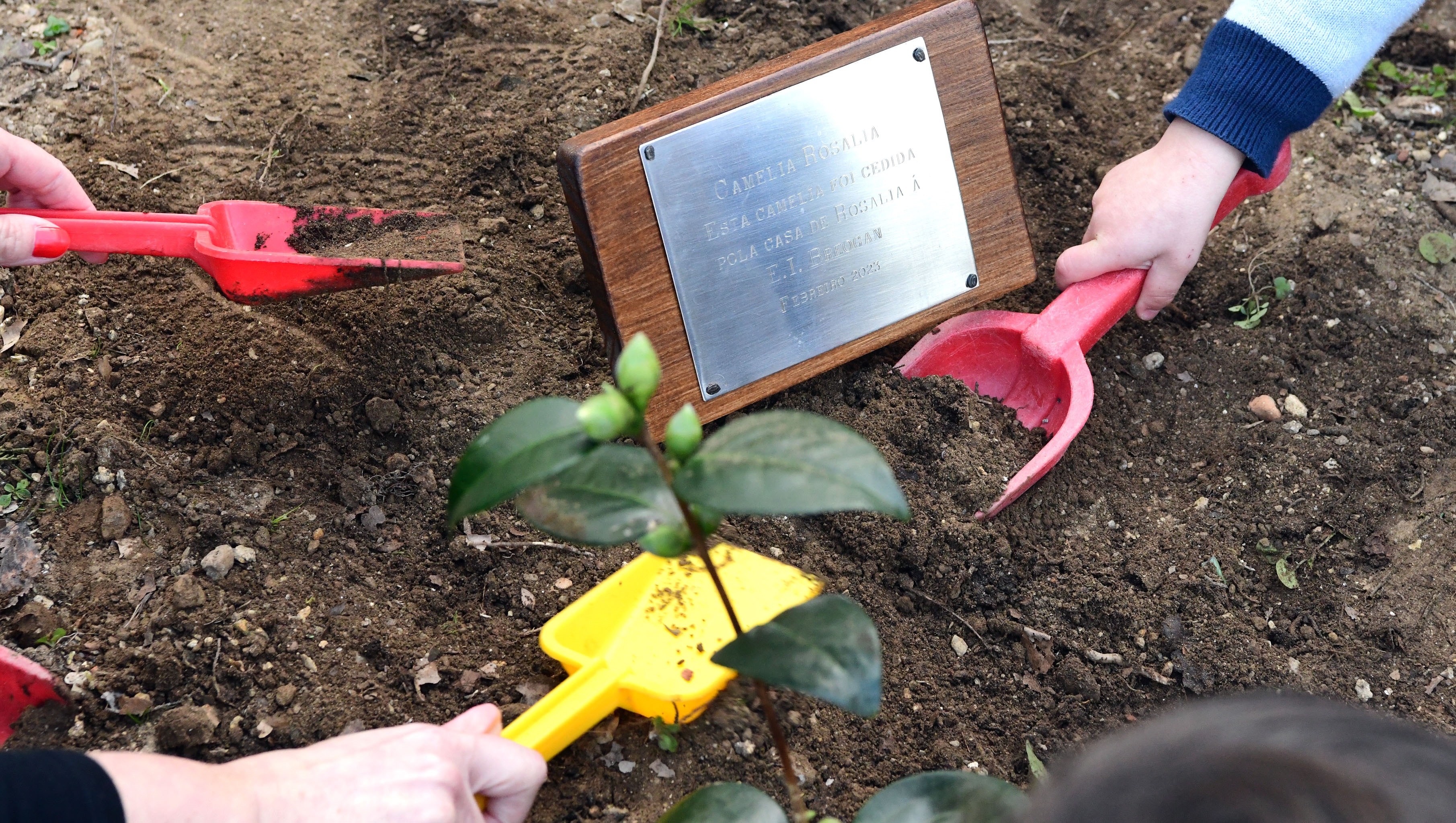 “Para darlle forma pensamos en tres figuras literarias de referencia como poden ser Rosalía de Castro, Lorca ou Valle-Inclán e vincular, cada unha delas, cunha planta ou árbore específica”, engade. Xusto antes de saír ao xardín, o persoal do centro recitou, xunto á cativada, algúns dos poemas rosalianos máis emblemáticos. A continuación, os nenos e nenas participaron na plantación dunha camelia da variedade ‘Rosalía de Castro’ xa preparada con todos os rexistros botánicos e fitosanitarios esixidos para ser plantada. Xunto a ela, enterrouse unha “caixa do tempo” cos datos máis relevantes da especie.