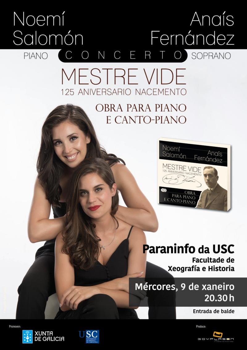 O Paraninfo da Universidade será o vindeiro 9 de xaneiro o escenario no que a pianista Noemí Salomón e a soprano Anaís Fernández interpretarán unha selección da extensa obra para piano e canto-piano do mestre José Fernández Vide. O concerto comezará ás 20.30 horas na Facultade de Xeografía e Historia organizado pola Secretaría Xeral de Política Lingüística da Xunta de Galicia en colaboración coa USC.