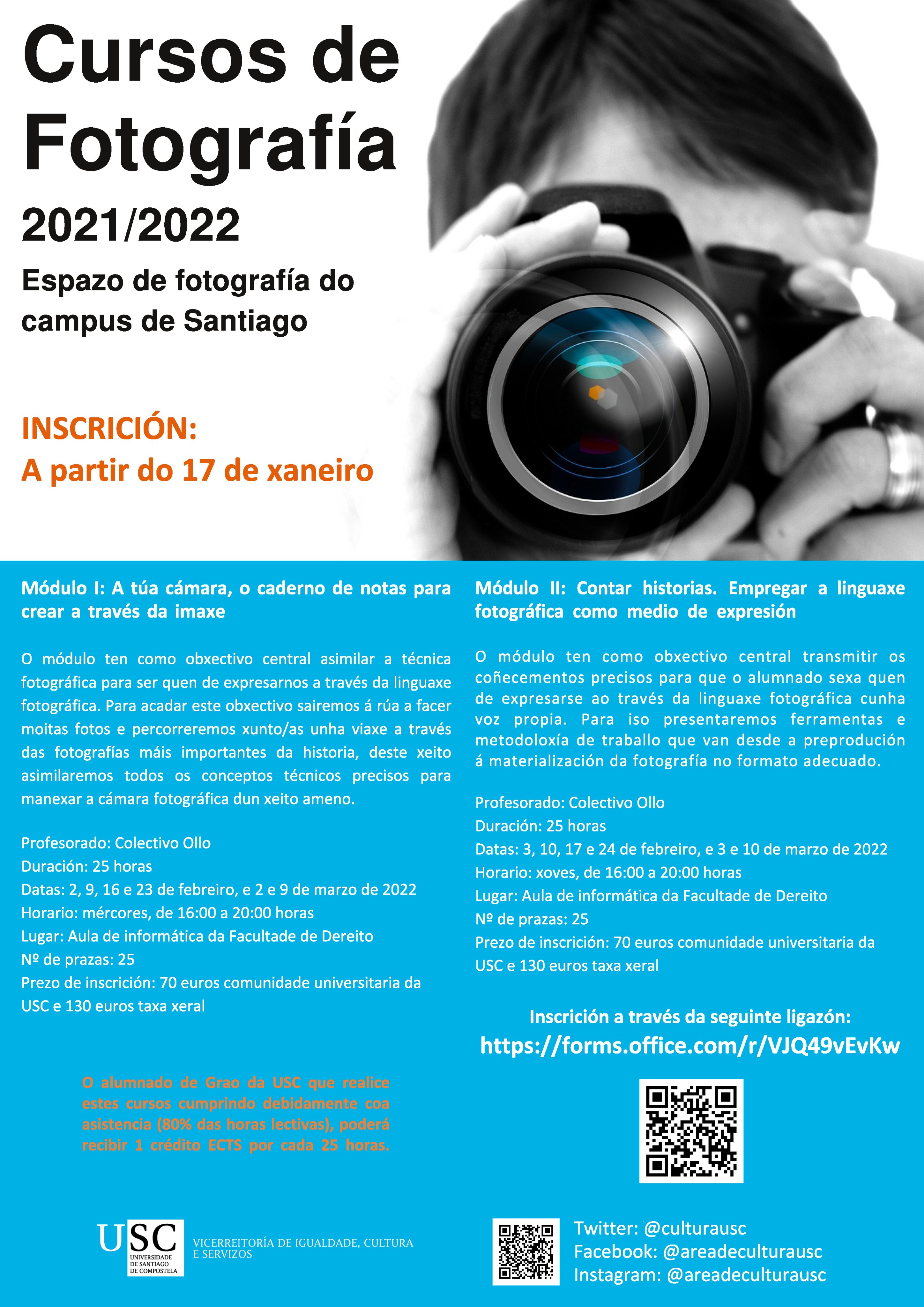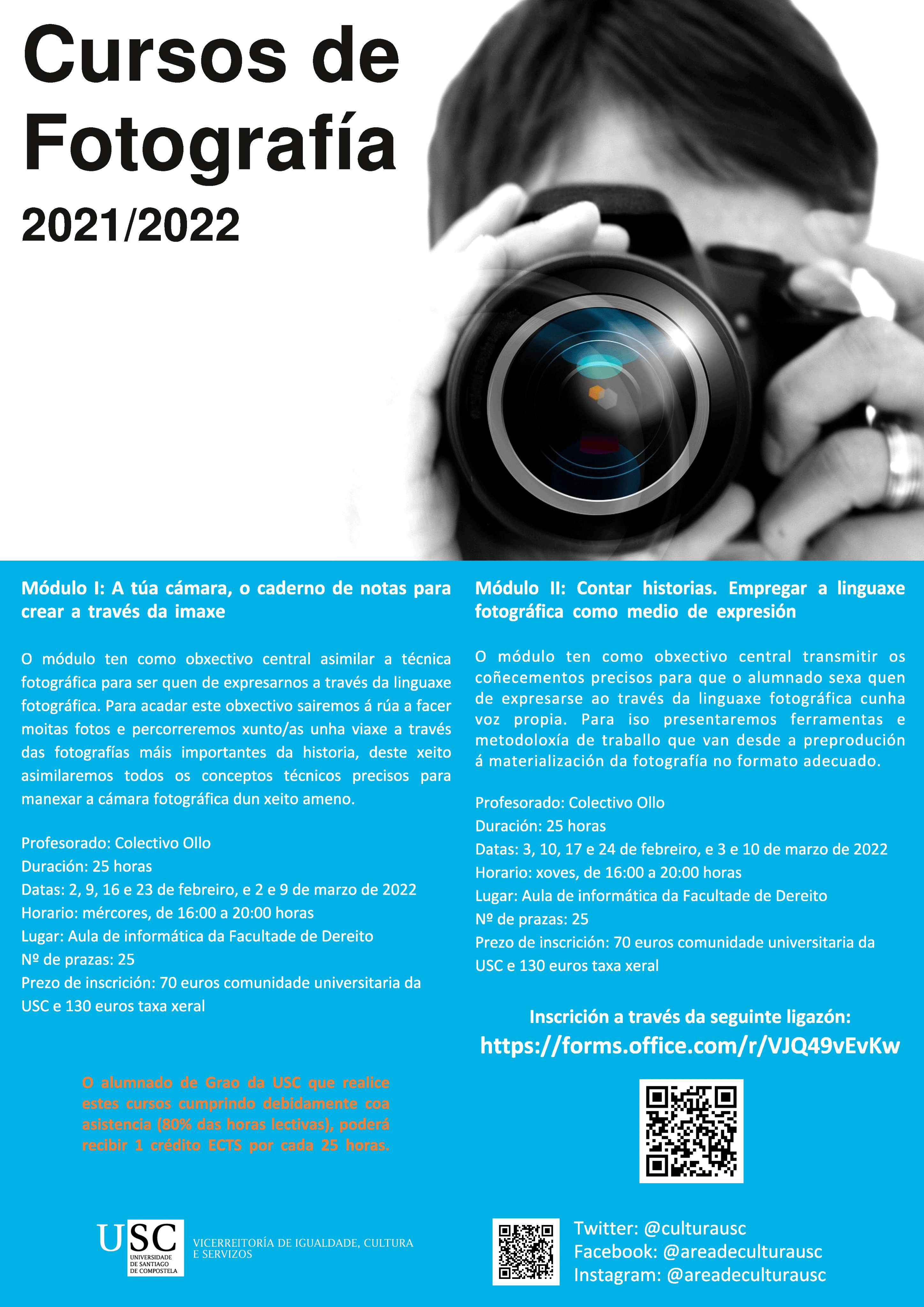 Tres módulos temáticos conforman a oferta de cursos de fotografía para o segundo semestre de 2021/2022, que a Área de Cultura da USC ten programado desenvolver tanto en Santiago como no Campus de Lugo. Xa está aberto o período de inscrición, trámite que se realizará a través da web.