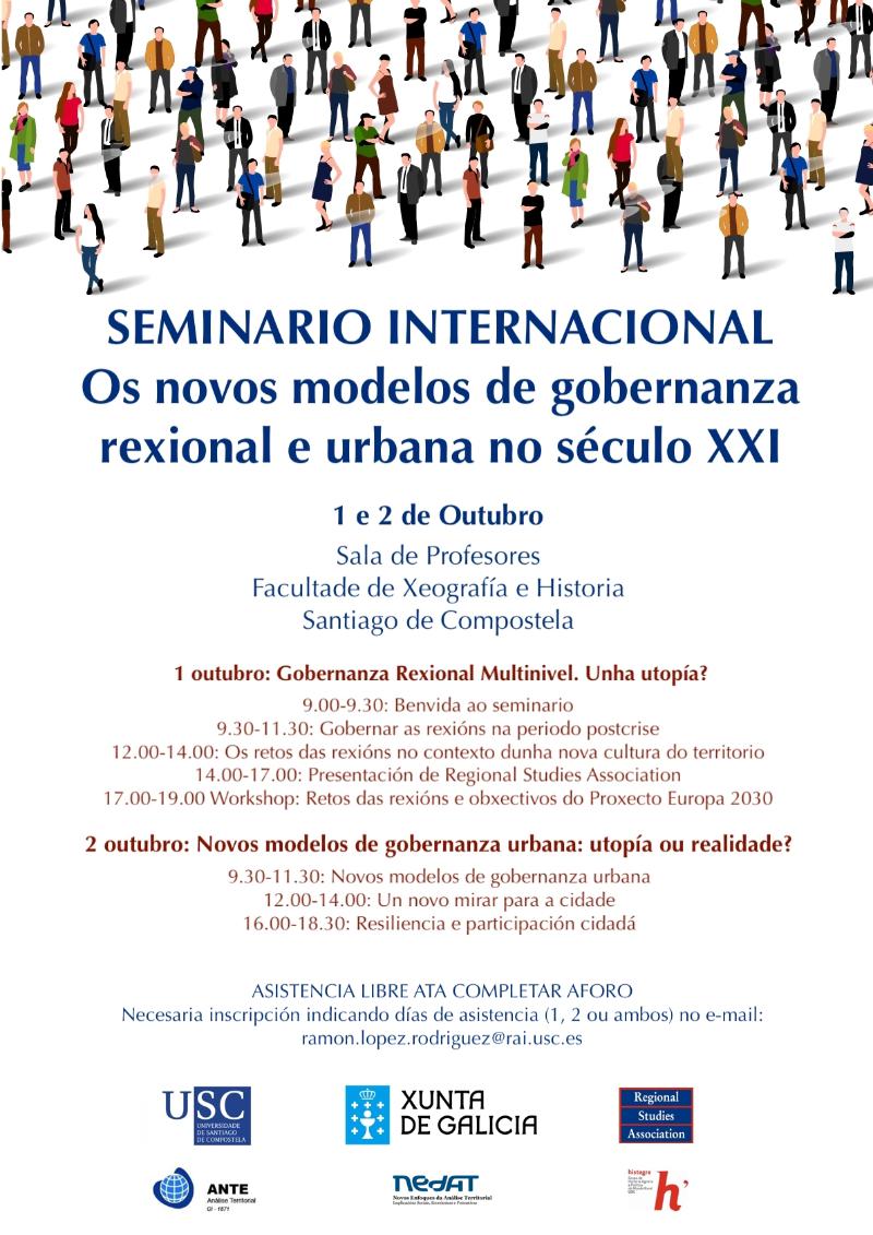 Os novos modelos de gobernanza rexional e urbana neste tempo serán obxecto de reflexión a vindeira semana, entre os días 1 e 2 de outubro, nun seminario a desenvolver na Facultade de Xeografía e Historia. A asistencia é gratuíta, sendo precisa ramon.lopez.rodriguez [at] rai.usc.es (inscrición previa).