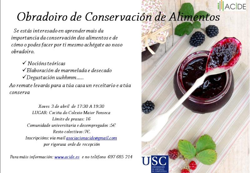 Un obradoiro no Colexio Maior Fonseca aborda as distintas consideracións que se deben atender para unha correcta conservación dos alimentos. Está é unha iniciativa organizada pola asociación ACIDE (Cidadáns polo Desenvolvemento) que se celebrará este xoves 3 de 17.30 a 19.30 horas. Nestas dúas horas falarase da importancia da conservación dos alimentos e ofreceranse nocións teóricas dos diferentes tipos de conservacións, completando a sesión cunha demostración práctica dos contidos analizados. Esta actividade ten un custe para a comunidade universitaria de 5 euros en concepto de axuda para a adquisición de materiais.