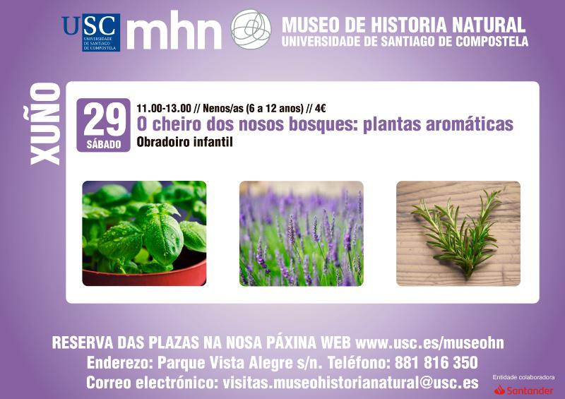 O Museo de Historia Natural celebrará o próximo sábado 29 o obradoiro ‘O cheiro dos nosos bosques: plantas aromáticas’ dirixido a rapaces de 6 a 12 anos. Celebrarase de 11.00 a 13.00 horas e estará impartido pola titulada en Bioloxía Silvia Romero Río. A reserva de prazas pode realizarse a través da web do Museo de Historia Natural.