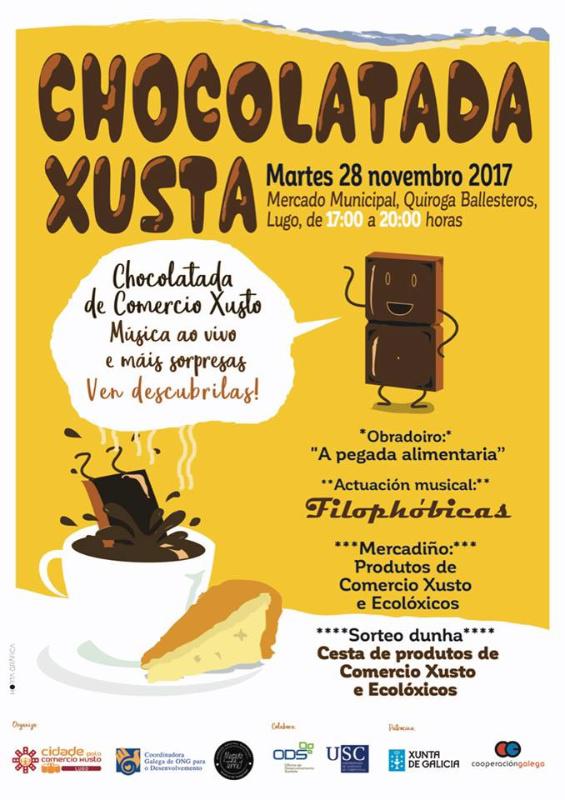 O realización deste taller sobre pegada alimentaria desenvolverase no marco dunha actividade máis ampla, que se prolongará ata as 20.00 horas, e no marco da que a plataforma Lugo Xusta organizará unha Chocolatada Xusta. Un mercadiño de comercio xusto, música ao vivo da man de ‘ Filophóbicas’, e o sorteo dunha cesta de produtos de comercio xusto, complementan esta xornada de acceso libre e de balde para todo o público interesado.