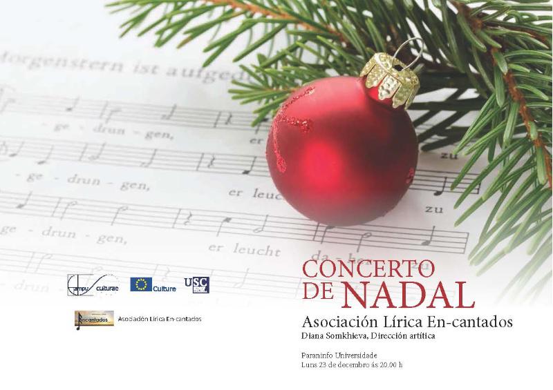A Asociación Lírica En-cantados ofrece este luns 23 un concerto de Nadal no Paraninfo da Universidade (Facultade de Xeografía e Historia). Será ás 20.00 horas coa entrada libre ata completar o aforo. A formación, con Diana Somkhieva na dirección artística, interpretará un repertorio composto por numerosas arias, dúos e tríos de ópera, pezas clásicas e non tanto obra de autores como Mozart, Tosti, Mendelsohn, Orff, Vivaldi, Caldara, Scarlatti, Moises Hogan, Bellini, Puccini, Händel, Grieg, Donizetti, Bizet e Gounod.