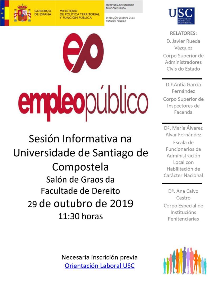 A Área de Orientación e Inserción Laboral da USC organiza conxuntamente coa Dirección General de Función Pública, a xornada ‘As oportunidades do emprego público’ que terá lugar no Salón de Graos da Facultade de Dereito, o martes 29 de outubro, entre as 11:30 e as 13:00 horas. O obxectivo da xornada é dar a coñecer as diferentes posibilidades de traballo que ofrece a administración pública, neste caso a nivel estatal, dirixidas a titulados universitarios.