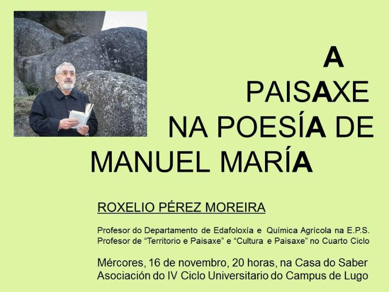 A paisaxe na obra poética de Manuel María centra a temática do relatorio que ofrecerá este mércores, a partir das 20.00 horas, no auditorio da Casa do Saber, Roxelio Pérez Moreira, profesor do Departamento de Edafoloxía e Química Agrícola da USC.