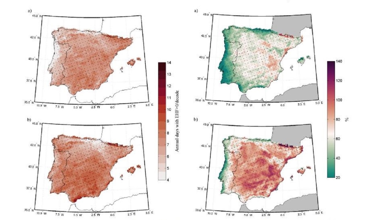 Un estudo sobre proxeccións climáticas no que participan investigadores da USC e da UVigo prevé un aumento da intensidade das ondas de calor do 104% para o futuro próximo (2021-2050) en toda a Península Ibérica. Os cambios máis importantes apuntados nesta investigación, que vén de se publicada na revista internacional Atmospheric Research, prodúcense na rexión centro-leste, chegando ao 150% para a costa mediterránea e os Pirineos. Os autores deste traballo, entre os que figuran Nieves Lorenzo, Alejandro Díaz-Poso e Dominic Royé, tamén estiman unha maior extensión espacial das ondas de calor con tendencias do 6% ao 8% por década, o que suxire unha maior exposición humana, un aumento demanda de enerxía e implicacións para o risco de incendio.