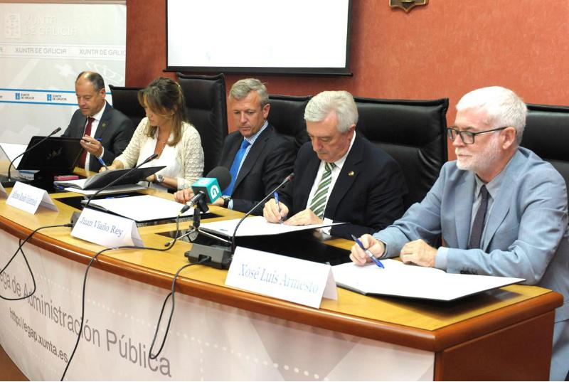 O reitor Juan Viaño xunto aos reitores da Coruña e Vigo asinaron este mércores un convenio co presidente do Consello Reitor da Escola Galega de Administración Pública (EGAP), Alfonso Rueda Valenzuela, polo que o persoal de administración e servizos das institucións universitarias galegas terán acceso ao programa formativo da EGAP. Segundo o acordo subscrito, ofertaranse 27 cursos nos que se tratarán temas de especial interese para o ámbito administrativo con títulos sobre a elaboración de informes, utilización de ferramentas informáticas, o desenvolvemento de habilidades comunicativas, administración electrónica, protección de datos, interpretación de datos estatístico ou a motivación dentro das organizacións. Cada curso ten o seu propio formato xa que se impartirán en modalidade presencial, pero tamén os haberá en modo de telefomación ou autoformación. Esta iniciativa pon de manifesto o principio de colaboración entre institucións e agárdase que axude a aumentar a eficacia na xestión dos recursos a través do aproveitamento da experiencia e materiais de que dispón a EGAP, centro de referencia para a formación de empregados e empregadas do sector público con máis de 30.000 prazas ofertadas o pasado ano entre cursos, xornadas e actividades.