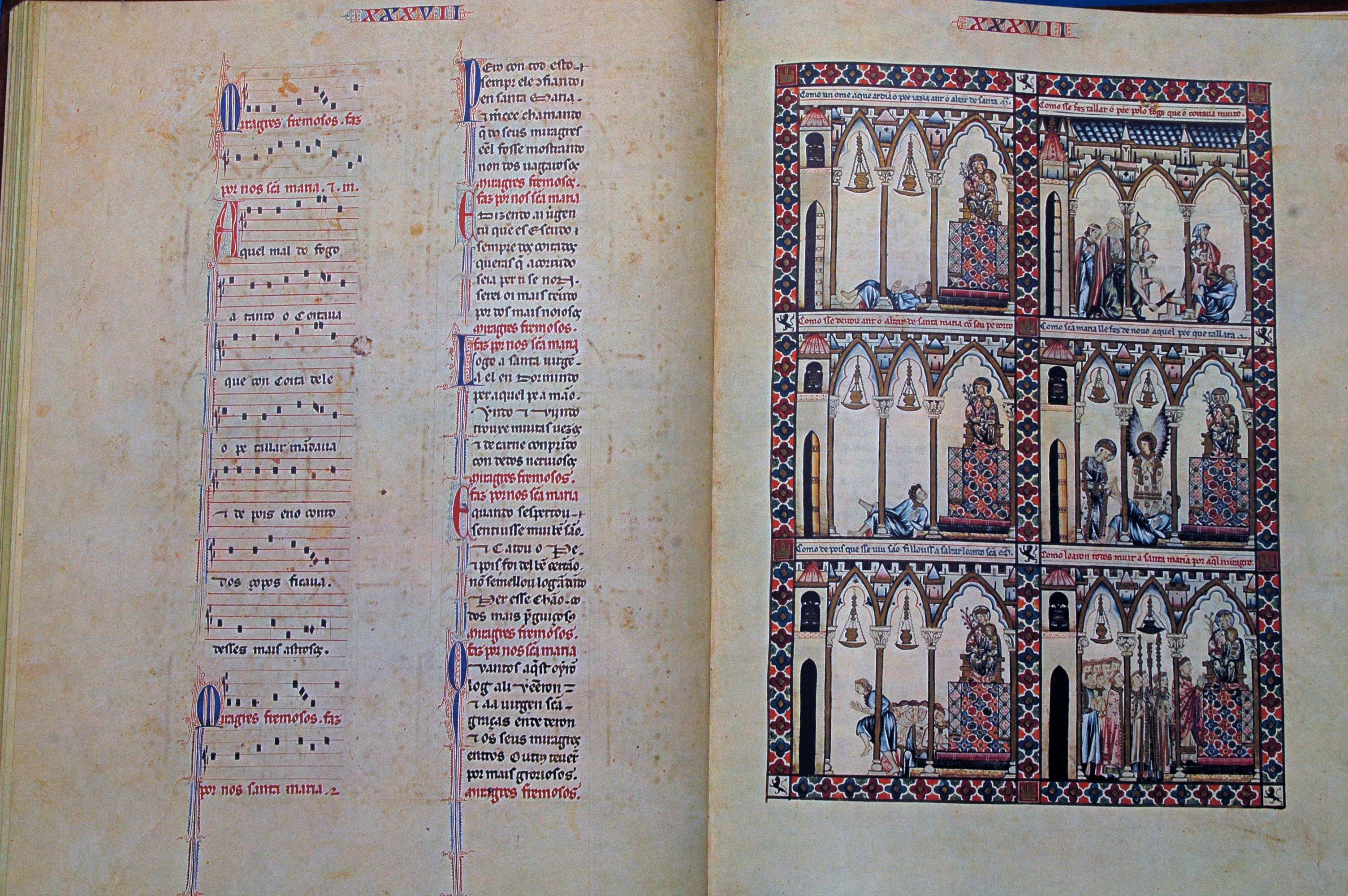 Dúas das páxinas dun dos códices medievais que recollen as 'Cantigas de Santa María'