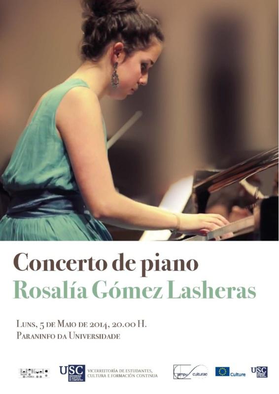 A pianista Rosalía Gómez Lasheras leva a Bach, Mozart ou Albéniz ao Paraninfo da Universidade, na Facultade de Historia, nun concerto que se celebrará o vindeiro luns 5 de maio ás 20.00 horas, organizado pola vicerreitoría de Estudantes, Cultura e Formación CampUSCulturae e a escola de música Berenguela. Así nunha primeira parte do concerto, Rosalía Gómez interpretará o Preludio e fuga en Fa Menor de J.S. Bach, a Sonata nº 13 en Si bemol maior de Mozart e a Sonata Fantasía de Scriabin. Na segunda parte a pianista interpretará o Preludio e fuga en Fa menor, de Shostakovich, o Corpus Christi de Albéniz e o concerto rematará coas variacións sobre un tema de Paganini, de Brahms. Rosalía Gómez Lasheras Despois de comezar os seus estudos de piano aos cinco anos con Alexander Gold e María José cerviño, en 2011 Rosalía Gómez obtivo o Premio Extraordinario do Conservatorio de Santiago de Compostela e actualmente estuda no Utrechts Conservatory. Gañou numerosos primeiros premios en recoñecidos concursos nacionais e internacionais como o XVI Concurso de Piano Infanta Cristina (Madrid, 2012), o XV Cicle de Primavera (Barcelona 2012), o Premio Chopin no VII Concurso de Piano Alto Minho (Portugal, 2010) ou o Young Pianist Foundation Competition (Amsterdam, 2012). Conta cunha ampla experiencia como solista con orquestras como a Real Filharmonía de Galicia, Orquestra Presjovem, Orkestacademie e Noord Nederlands Orkest, destacando a súa interpretación do Concerto Jeune-Homme de Mozart baixo a batuta de Philippe Herreweghe.