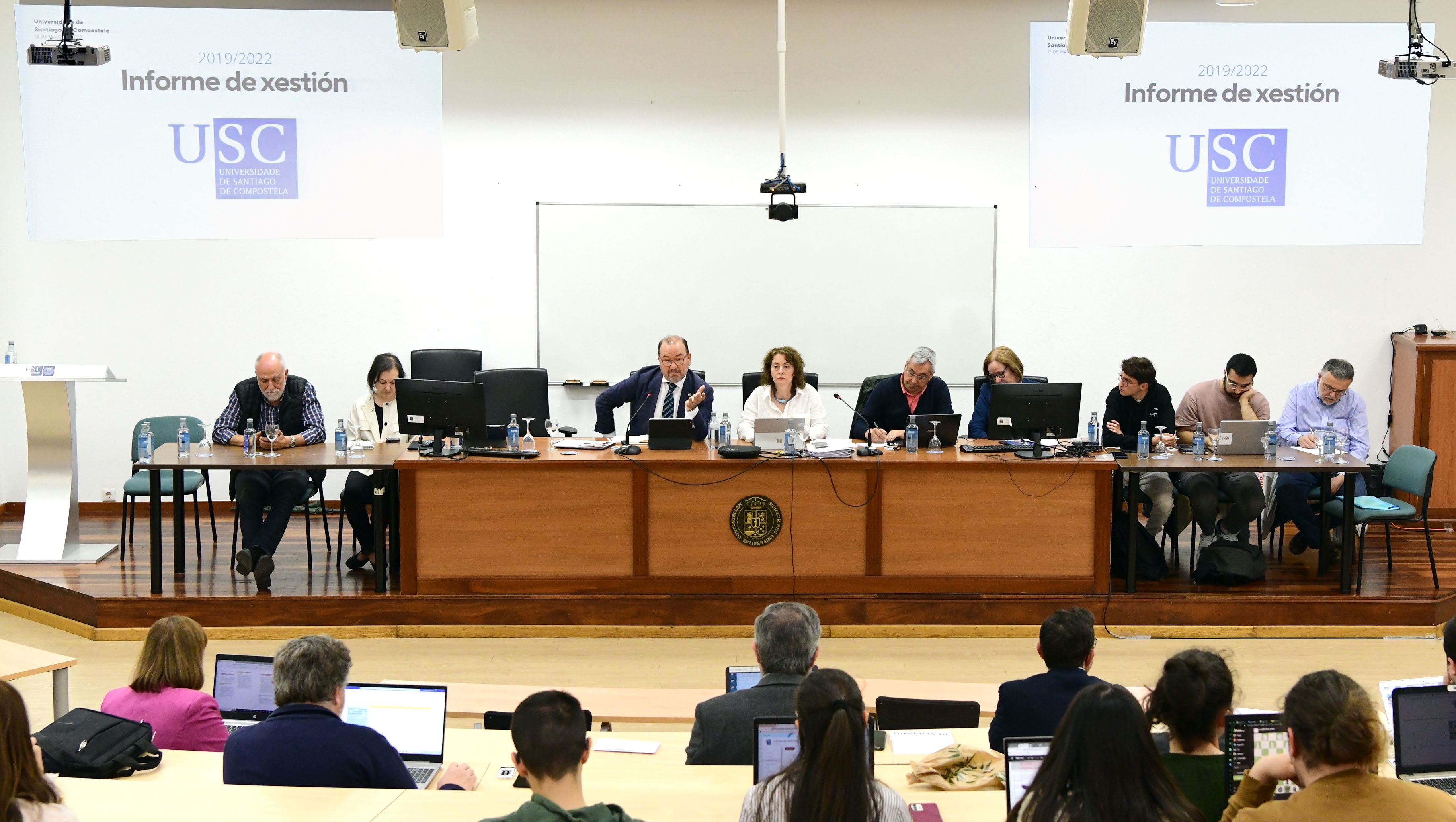 As políticas de persoal, o estudantado e a transformación dixital, eixos do Informe de Xestión 2019-2022 presentado polo reitor no Claustro