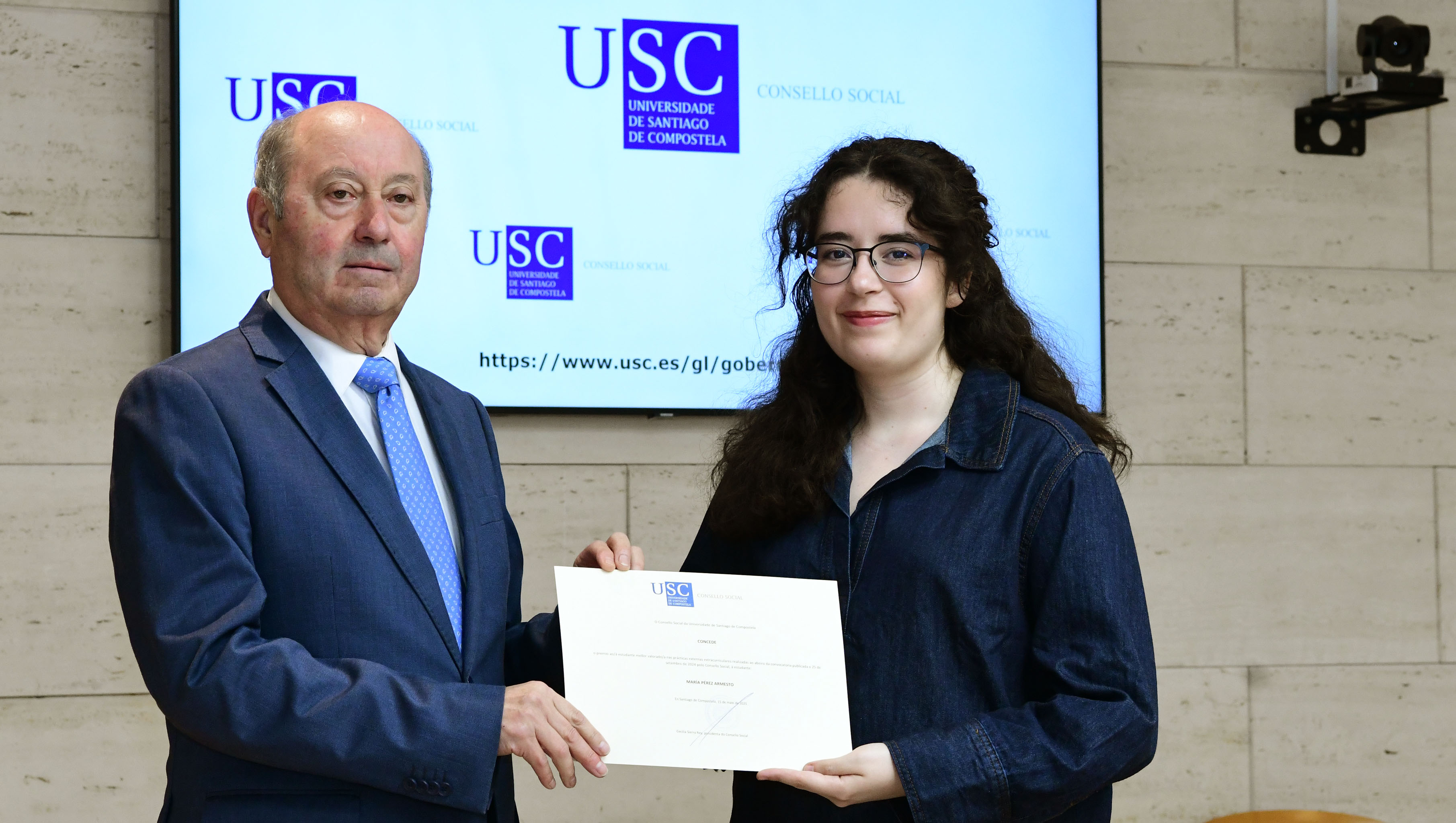 María Pérez Armesto, do Máster Universitario en Matemáticas da USC, recolleu este venres o premio  que o Consello Social da USC lle concedeu por ser a estudante mellor valorada nas prácticas xestionadas por este órgano que rexe a participación da sociedade na Universidade. “A experiencia foi moi enriquecedora tanto polo traballo realizado como pola atención que recibín en todo momento polo equipo do Centro Singular de Investigación en Tecnoloxías Intelixentes da USC (CiTIUS)” no que fixo as prácticas o pasado decembro.