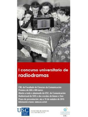 O alumnado da USC, das titulacións de Comunicación Audiovisual das universidades da Coruña e Vigo e das escolas de Imaxe e Son de Galicia xa pode apuntarse á primeira edición dos Premios de radiodramas en galego que organiza a Comisión de Normalización Lingüística da Facultade de Ciencias da Comunicación coa colaboración do Servizo de Normalización Lingüística da USC. As persoas interesadas dispoñen ata o día 15 de outubro para presentaren as súas propostas de radiodramas, que non poden superar os 10 minutos, con formato de guión radiofónico dramático escrito e de gravación en arquivo dixital (mp3 ou calquera dos habitualmente utilizados en radio). Os premios están dotados con dous galardóns de 500 e 400€, respectivamente, para os dous proxectos mellor valorados polo xurado. Os radiodramas Os radiodramas son dramas de ficción que se transmiten a través da radio; dependen logo dos diálogos, da música e dos efectos de son para axudar ás persoas oíntes a imaxinaren a historia que se lles propón. As súas épocas de esplendor foron os anos 30, 40 e 50, e foron esmorecendo coa chegada da televisión.