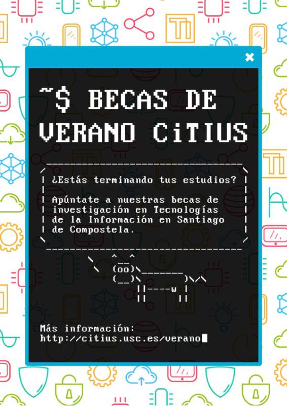 Por terceiro ano consecutivo, o CiTIUS convoca o seu programa de bolsas de verán, con 10 axudas de inicio á investigación dirixidas a estudantes de grao que desexen comezar a súa actividade científica no centro. As estadías, que se desenvolverán durante o mes de xullo, están dotadas con 700 euros e inclúen unha axuda económica destinada a gastos de viaxe para as persoas non residentes en Compostela.