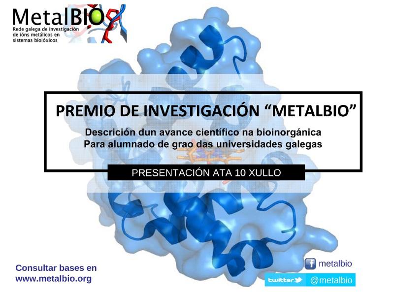 A Rede galega de investigación de ións metálicos en sistemas biolóxicos (MetalBIO) vén de convocar o I Premio de Investigación MetalBIO, un certame dotado con 400 euros en metálico para a proposta gañadora, ademais da matrícula de balde no curso da Universidade de Verán 2015 da USC ‘Retos e oportunidades da industria de procesos químicos’, e a través do que se pretende incentivar e promover a actividade científica e divulgativa entre o estudantado das universidades galegas. Avanzar na sensibilización sobre a importancia da investigación, en particular no ámbito da bioinorgánica e da bioquímica, como vía de progreso da sociedade, é outra das premisas coas que nace esta convocatoria lanzada pola rede de investigación galega. Asemade, a través deste tipo de iniciativas, a rede MetalBIO e a Asociación Profesional para a Difusión da Ciencia Química queren reivindicar a necesidade de reforzar a aposta polo sistema de I+D+i como base para superar moitos dos retos aos que se afronta a humanidade, retos que en moitos casos pasan pola optimización de recursos (alimenticios, ambientais, materiais, etc.) como vía para a consecución de melloras sociais e de saúde e tamén para o desenvolvemento económico. O I Premio de Investigación MetalBIO é unha nova mostra do compromiso manifestado polos membros desta rede para traballar a prol da superación deste restos desde o seu ámbito de coñecemento para o desenvolvemento de novos fármacos ou produtos con propiedades terapéuticas, marcadores para radio-diagnose, catalizadores biomiméticos con aplicacións en procesos industriais e alimenticios, control e tratamento de contaminación por ións pesados... Este compromiso fundaméntase, segundo explican desde esta rede galega de investigación, na intención de procurar unha orientación aplicada da investigación, buscando así que sexa útil para a sociedade nos prazos máis curtos posible, segundo subliñan os científicos agromados a carón da Rede MetalBIO. Bases do Premio MetalBIO O I Premio de investigación MetalBIO está aberto á participación de calquera alumno ou alumna con matrícula nun grao en calquera das universidades galegas durante o curso 2014-2015. Os/as candidatos/as deberán presentar un proxecto científico en formato cartel no que se describa un avance científico no ámbito da bioinorgánica ou da bioquímica de metaloproteínas, tal e como se recolle nas bases desta convocatoria O prazo de presentación de candidaturas rematará o vindeiro 10 de xullo de 2015. Os participantes deberán remitir as súas respectivas propostas ao enderezo de correo electrónico metalbio [at] metalbio.org (metalbio[at]metalbio[dot]org). O autor/a do proxecto galardoado recibirá como premio 400 euros en metálico, ademais de diploma acreditativo e da matrícula gratuíta no curso da Universidade de Verán 2015 da USC ‘Retos e oportunidades da industria de procesos químicos’.