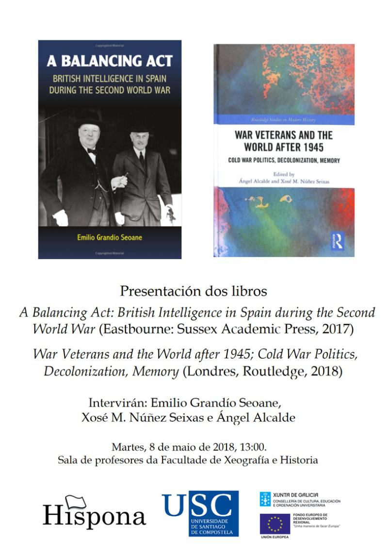 Trátase de A Balancing Act: British Intelligence in Spain during the Second World War, de Emilio Grandío Seoane e publicado por Sussex Academic Press en Eastbourne en 2017; e War Veterans and the World after 1945: Cold War Politics, Decolonization, Memory, editado por Xosé M. Núñez Seixas e Ángel Alcalde e publicado en Londres por Routledge en 2018. Na presentación estarán presentes os tres autores.