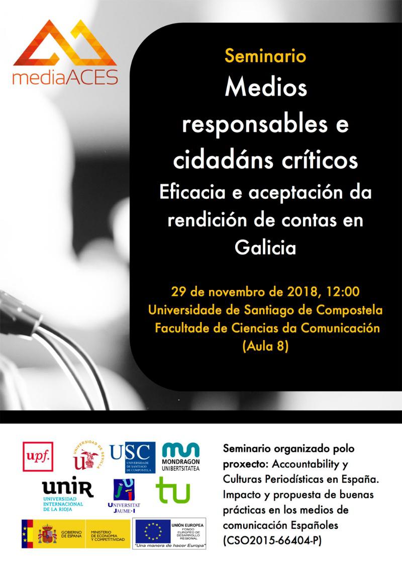 O proxecto de investigación ‘Accountability y Culturas Periodísticas en España. Impacto y propuesta de buenas prácticas en los medios de comunicación españoles’ (MediaACES) presentará a próxima semana os primeiros resultados da súa investigación. Será o día 29 no seminario ‘Medios responsables e cidadáns críticos. Eficacia e aceptación da rendición de contas en Galicia’ que terá lugar ás 12:00 horas na Facultade de Ciencias da Comunicación da man de Marcel Mauri, da Universitat Pompeu Fabra, e Marta Pérez Pereiro, da Universidade de Santiago.