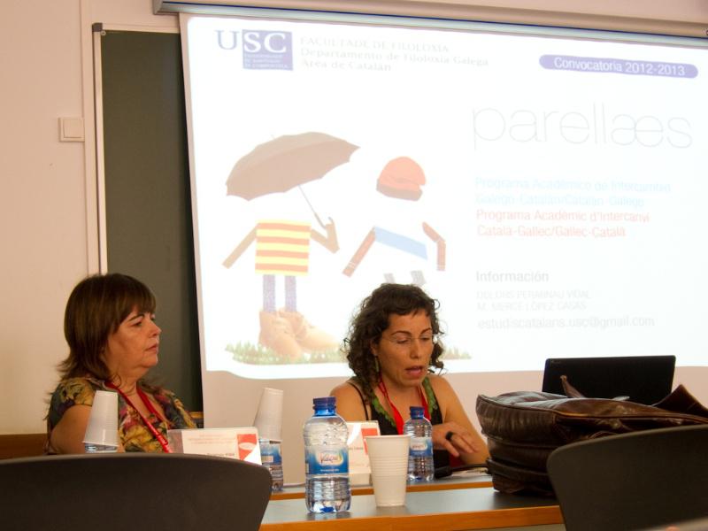 Ao abeiro do XVI Col·loqui Internacional de Llengua i Literatura Catalanes, celebrado do 1 ao 6 de xullo na Universidad de Salamanca, tivo lugar a presentación de Parellaes, programa académico de intercambio galego-catalán organizado pola Área de Catalán da Facultade de Filoloxía da USC. As profesoras responsables, Maria Mercè López Casas e Dolors Perarnau Vidal, amosaron dende a experiencia e a testemuña dalgúns dos participantes como este programa traballa simultaneamente os aspectos lingüístico e cultural destas dúas linguas ao tempo que fomenta o seu uso e valorización en tanto que linguas minorizadas do estado. A día de hoxe, Parellaes leva xa percorridas catro convocatorias, facendo do intercambio un lugar privilexiado de descuberta, non só de lingua e cultura alleas, senón tamén das propias. Aprender de xeito distentido Os participantes no programa Parellaes teñen a oportunidade de conversar coas súas respectivas parellas nun ambiente relaxado e axeitado para a práctica destes idiomas. Cada parella intégrana unha persoa catalanofalante e unha galegofalante, para que os intercambios sexan bidireccionais e mutuamente enriquecedores. O obxecto é que os participantes compartan unha ou dúas horas semanais do xeito que acorden: tomando un café, paseando pola cidade ou saíndo pola noite. As parellas asígnanse en función da dispoñibilidade horaria, afeccións e preferencias das persoas interesadas. O programa vai destinado, dunha banda, ao alumnado orixinario do ámbito lingüístico catalán que actualmente estuda na USC e, doutra, ao alumnado da universidade compostelá que curse actualmente ou teña cursado materias da Área de Filoloxía Catalá.