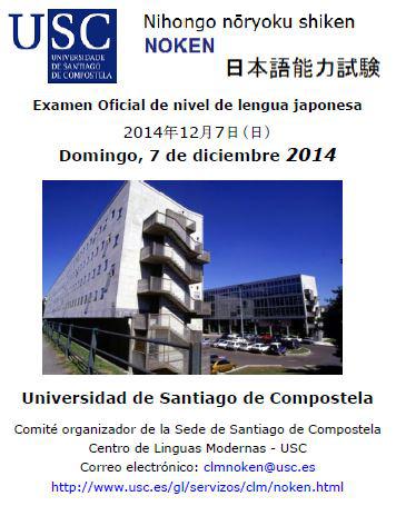 Preto dun cento de persoas matriculáronse para a realización do examen NOKEN de coñecemento da lingua xaponesa e que o Centro de Linguas Modernas celebrará este domingo 7 a partir das 9.00 horas na Facultade de Filoloxía de Santiago. A USC, xunto coas universidades de Granada, Autónoma de Barcelona e Autónoma de Madrid son as únicas que realizan este exame oficial en España.