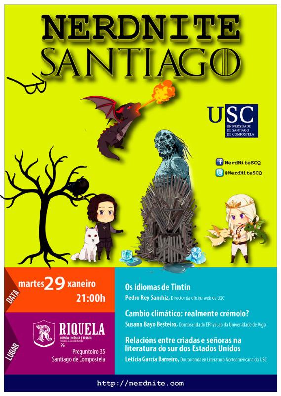 A primeira sesión das NerdNite Santiago celebrarase o vindeiro martes 29 de xaneiro con tres propostas que se achegan aos idiomas de Tintín, o cambio climático e relacións entre señoras e criadas na literatura sureña norteamericana. Esta nova Nerdnite celebrarase nesta ocasión en Riquela (r/Preguntoiro, 35) a partir das 21.00 horas.