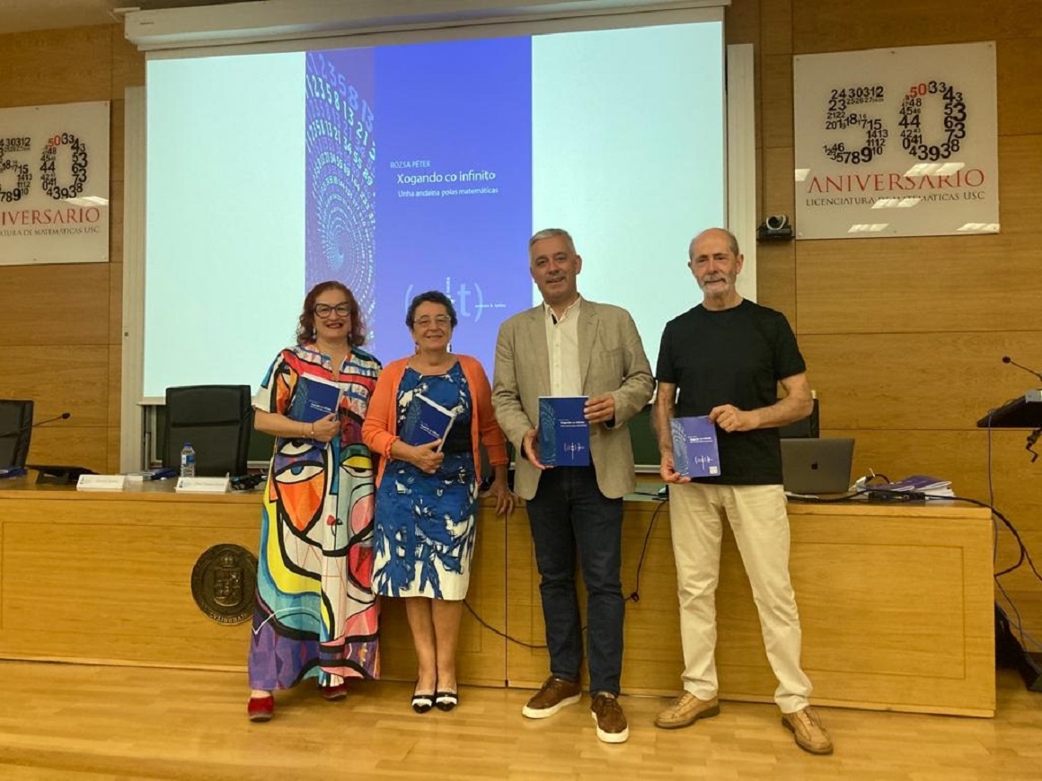 A Facultade de Matemáticas da USC foi escenario este xoves 22 da presentación da tradución ao galego de Xogando co infinito, editada polo Consello da Cultura Galega (CCG), coa colaboración da Secretaría Xeral de Política Lingüística. Trátase dunha obra divulgativa que escribiu a húngara Rózsa Péter hai oitenta anos arredor de conceptos matemáticos relacionados co infinito e que conta con dous textos introdutorios, un dos cales é obra da decana do centro, Elena Vázquez Cendón. O tradutor do volume é o profesor da USC Felipe Gago.