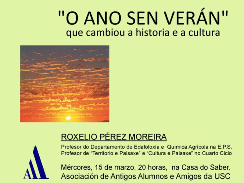 O ano 1816 , que foi o “ano sen verán” pola acción coincidente dunha erupción volcánica e unha cíclica diminución da actividade solar, un fenómeno que tivo moi relevantes consecuencias que cambiaron o rumbo da historia, da arte e da literatura, será o fío argumental da conferencia que impartirá o profesor Pérez Moreira.