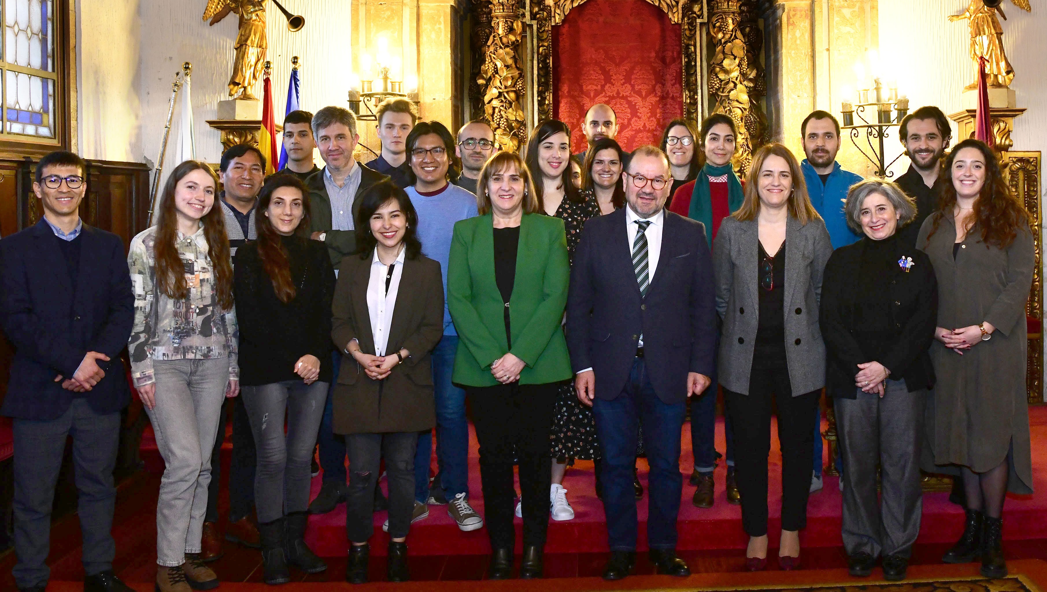 Foto de familia das persoas beneficiadas polas axudas de cooperación internacional na institución compostelá nun acto celebrado o pasado mes de marzo no Colexio San Xerome. O acto contou coa participación do reitor Antonio López; María José López Couso, vicerreitora de Titulacións e Internacionalización; e Erika Jaráiz Gulías, coordinadora do mestrado en Tecnoloxías en Márketing e Comunicación Política.